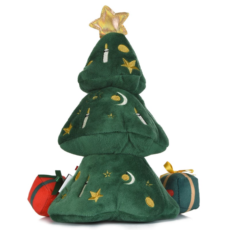 Unleash the magic of the Wizarding World with the Harry Potter Holiday Tree Burrow toy with Plush Squeaker Hogwarts House Presents. This Harry Potter dog toy is inspired by the Harry Potter films and designed as a fun dog toy your pup will love. It includes four small plushes designed to look like Christmas gifts with the insignia of each of the four Hogwarts Houses. These smaller plushes fit into the tree, so you can hide them and let your dog burrow with their nose and paws inside the tree to retrieve each small plush. This provides hours of engaging play for your dog. Adorable, cute, plush, snuggly, and fun to play with, this dog toy is an enchanting addition to any toy bin. Enjoy hours of magical fun as your pet plays with this Harry Potter dog toy featuring squeakers your dog will love.