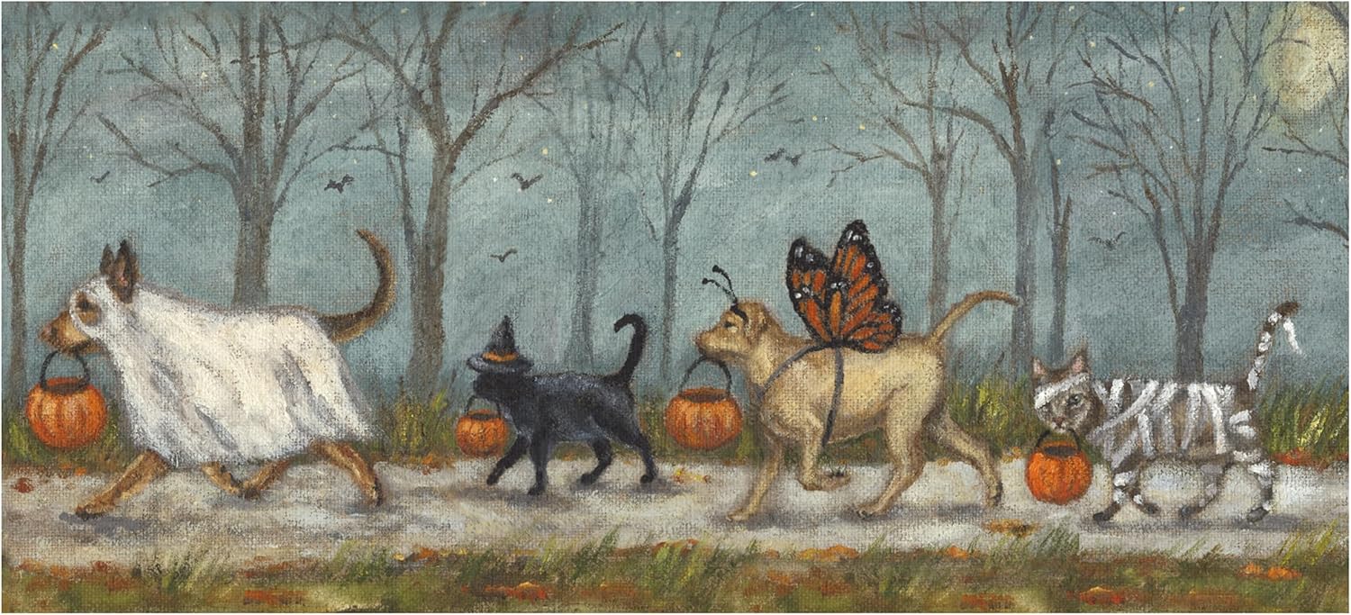 A polyester rug from our Halloween Collection displaying a fun design of pets in various Halloween costumes walking together holding treat buckets. Design is replicated from the original artwork painted onto burlap canvas, giving the art a unique depth and texture. The rug can be used indoors or outdoors and features skid-resistant backing to help stay in place. Spot cleaning recommended. Our Spooky Pet Parade rug comes packaged neatly rolled with a tag displaying the full rug design. A pet-themed seasonal home accent that adds functional style.