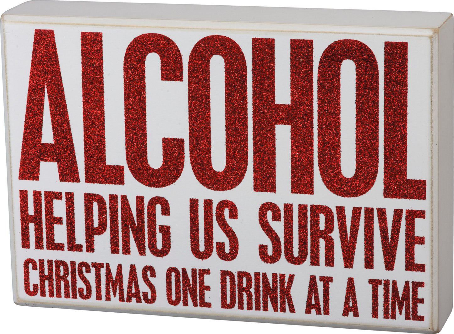 A white wooden box sign featuring a "Helping Us Survive Christmas One Drink At A Time" sentiment in red glitter details. Easy to hang or can free-stand alone.