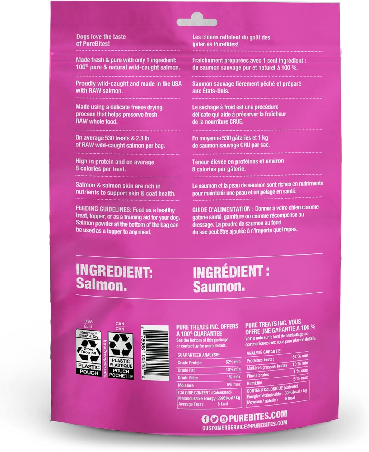 At PureBites, we're always asking pet parents to "Go ahead, look at our ingredients". Simplicity and the high-quality ingredients we choose to feed our family makes a difference. At PureBites this means every member of our family. PureBites RAW freeze dried salmon dog treats are the ultimate high-value limited ingredient treat or topper. Made with only 1 simple human grade ingredient you can read, pronounce, and trust: 100% pure wild-caught sockeye salmon. Nothing else. No artificial colors, fillers, or sweeteners. Proudly sourced and made in the USA using a delicate freeze drying process that helps preserve fresh RAW whole food, locking in the taste dogs crave and high protein / low calorie nutrition that pet parents love. Freeze dried treats are a great compliment to a RAW diet since they retain many of the benefits of RAW without the hassle of refrigeration.