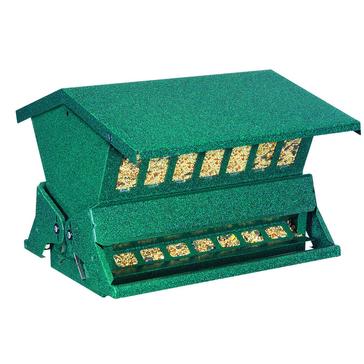 Double-sided feeding draws more Birds to yd. Adjustable weight settings to select the birds you want to feed. Spring operated perch drops & automatically shuts off access to seed. Holds over 12 lb (1 1/2 gallon) of seed. Front seed level indicator window. Seed Saver baffle reduces wasted seed. The exclusive top-lock feature holds the top open when filling.