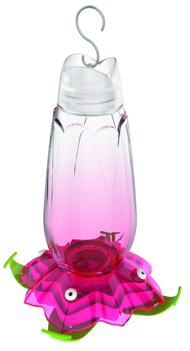 Purple floral 18-ounce hummingbird feeder. Built-in ant moat stops ants right in their tracks. Wide opening and flat top for easy filling. Easily disassembles for convenient cleaning. 3 green built-in perches allow hummingbirds to rest while feeding. Ombre glass bottle design with a purple plastic basin. 18-ounce nectar capacity.