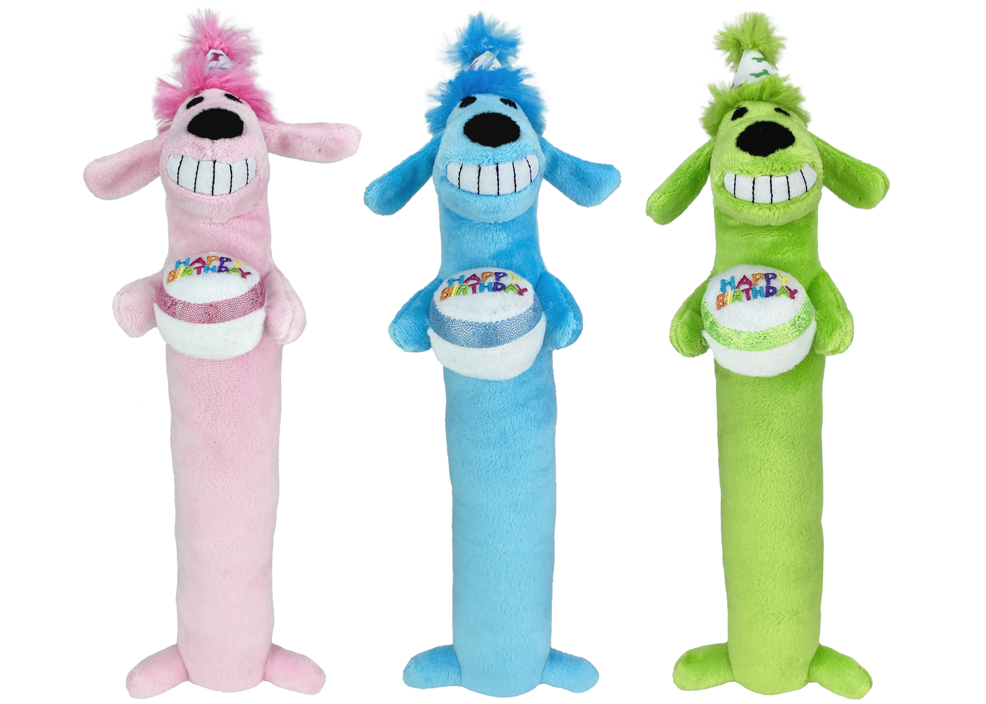Its time to party with the Loofa Dog Birthday dog toy! These extra-long plush dog toys feature pups decked out in birthday hats holding their very own birthday cakes! What better way to celebrate your dog's big day than with a soft and special Loofa Dog Birthday toy? Each toy measures 12 and is suitable for medium and large dogs.