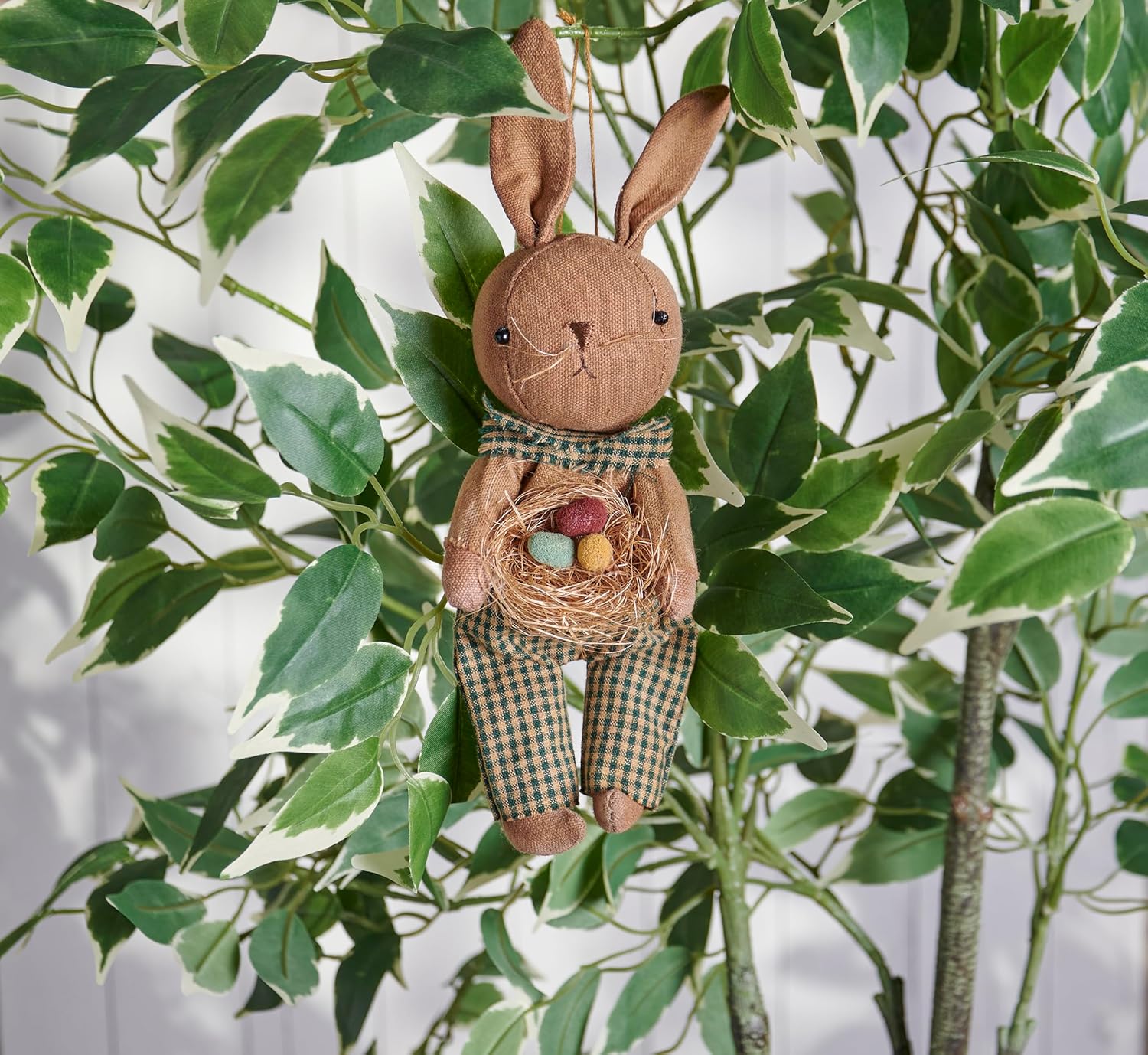 This charming decorative ornament features a primitive-inspired bunny doll holding a nest filled with colorful eggs. The Egg Basket Bunny ornament adds a rustic, seasonal touch to your home décor and offers versatile display options to suit any space. It comes with an attached string hanger for easy hanging on your tree, wreath, or wall. Perfect for bringing a cozy, festive vibe to your spring or Easter decorations, this ornament is a delightful accent that blends traditional charm with playful detail for any primitive-themed collection.