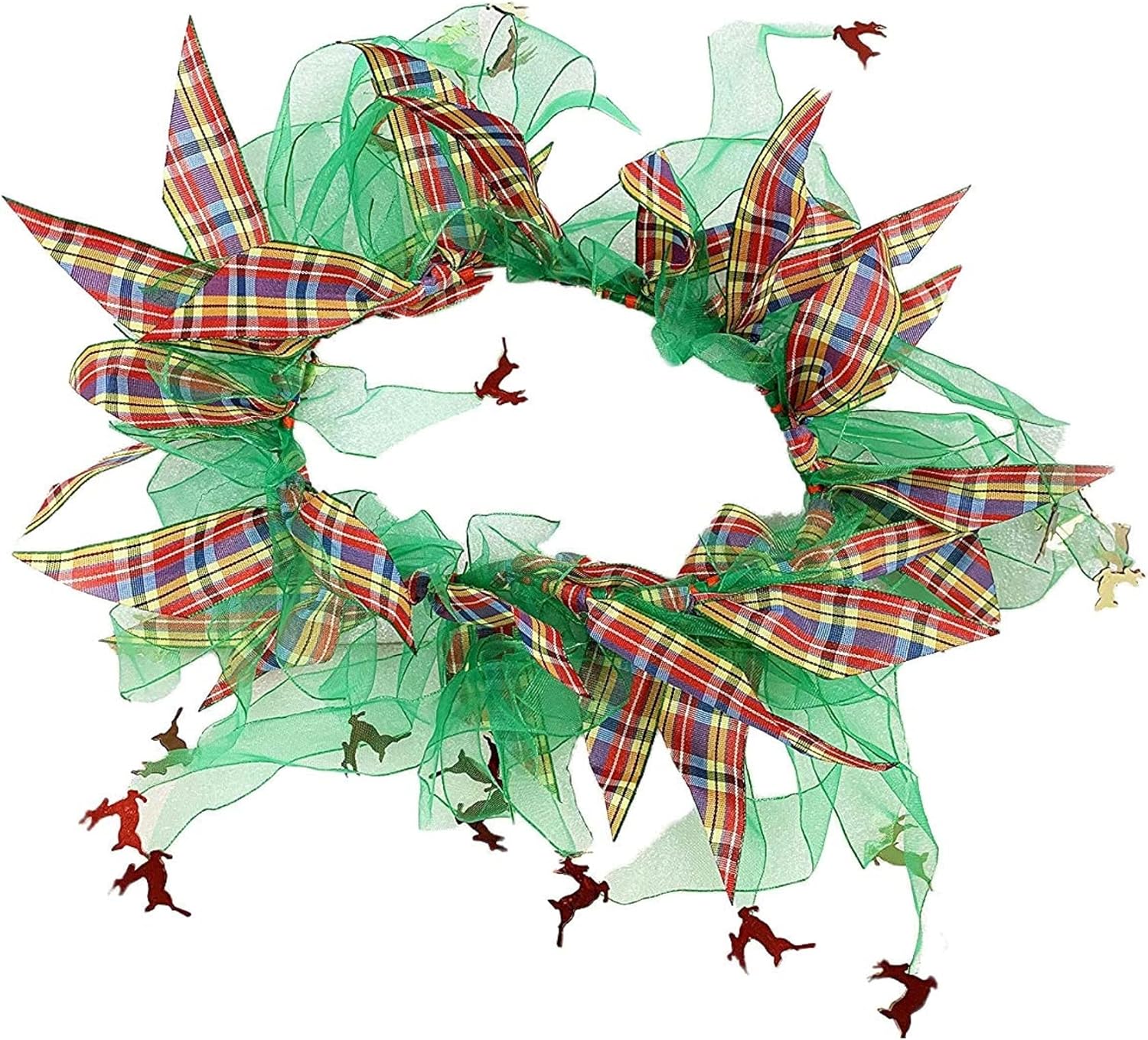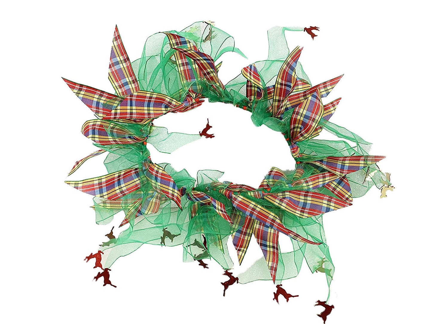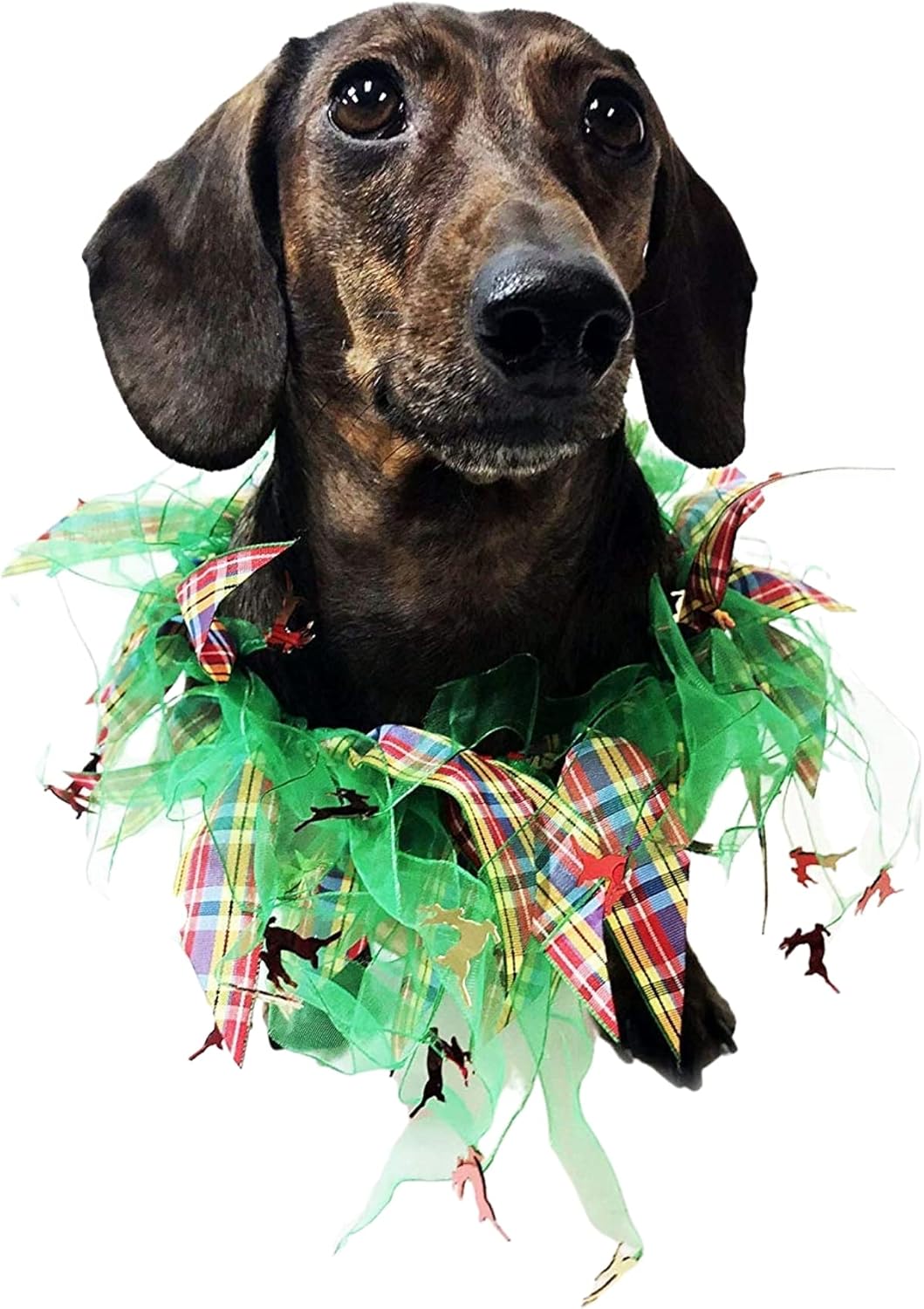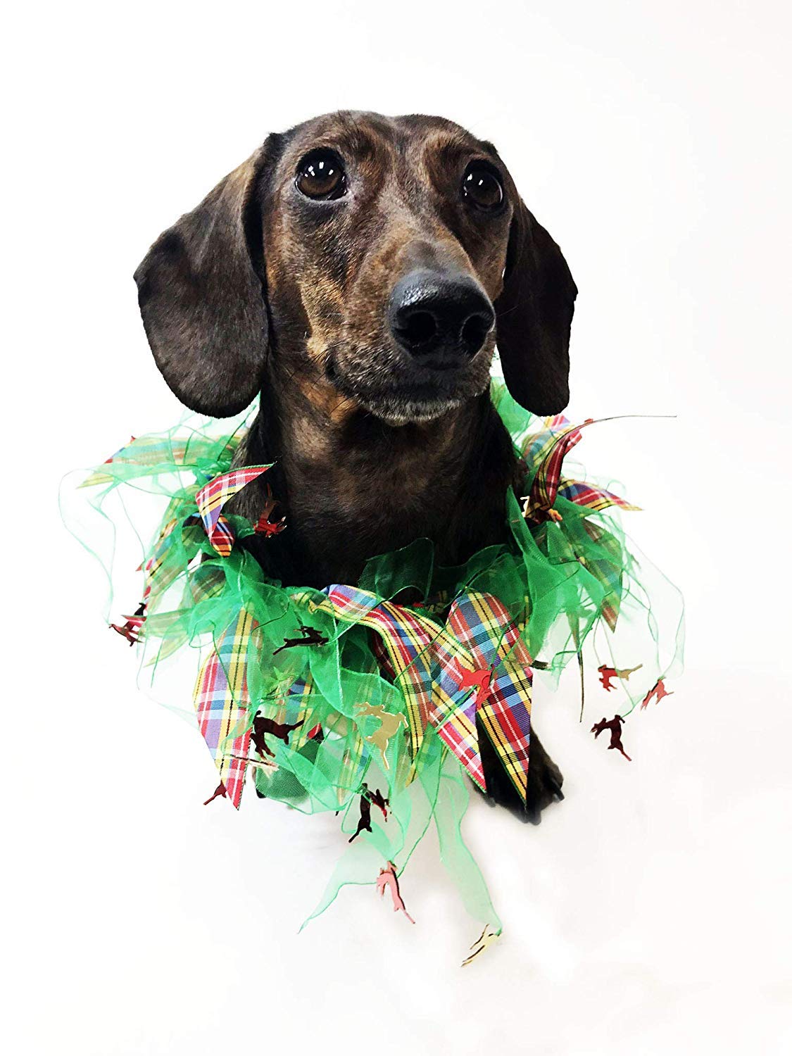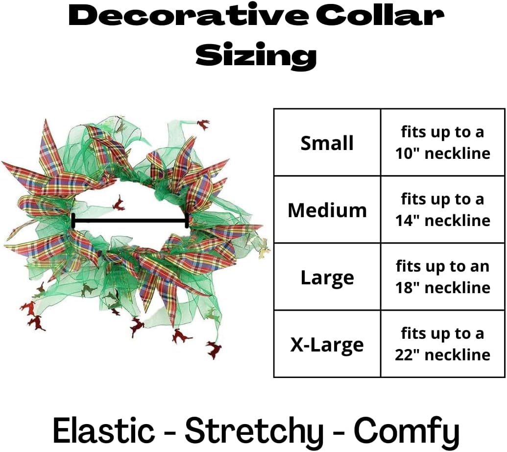 Green and Christmas plaid ribbons collar with tiny foil reindeer on each tip. Elastic collar for comfort and easy fit. A great way to accessorize this holiday season. Good for dogs or cats. Not to be used as a restraint. - Small fits up to a 10" neckline - Medium fits up to a 14" neckline - Large fits up to an 18" neckline - X-Large fits up to a 22" neckline.