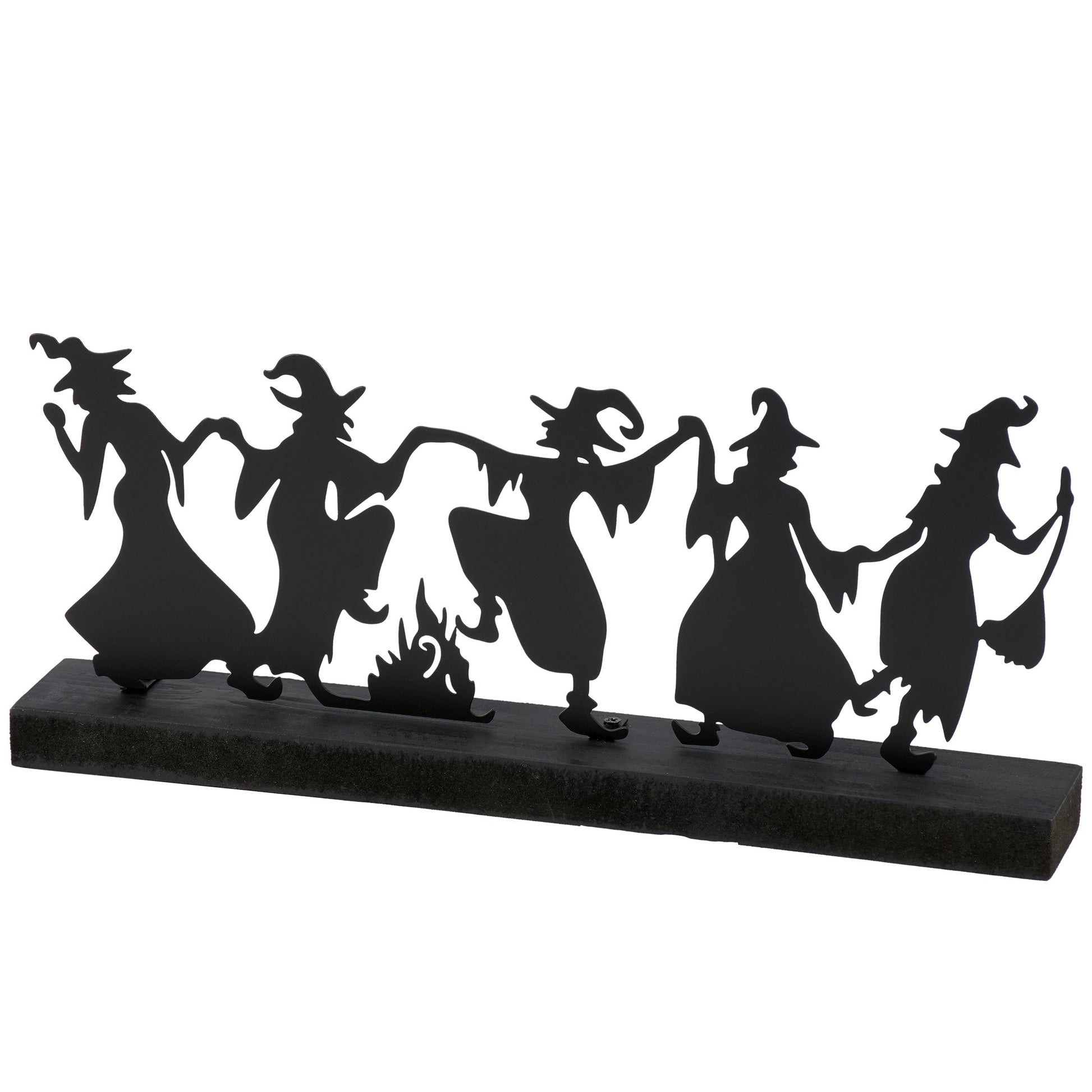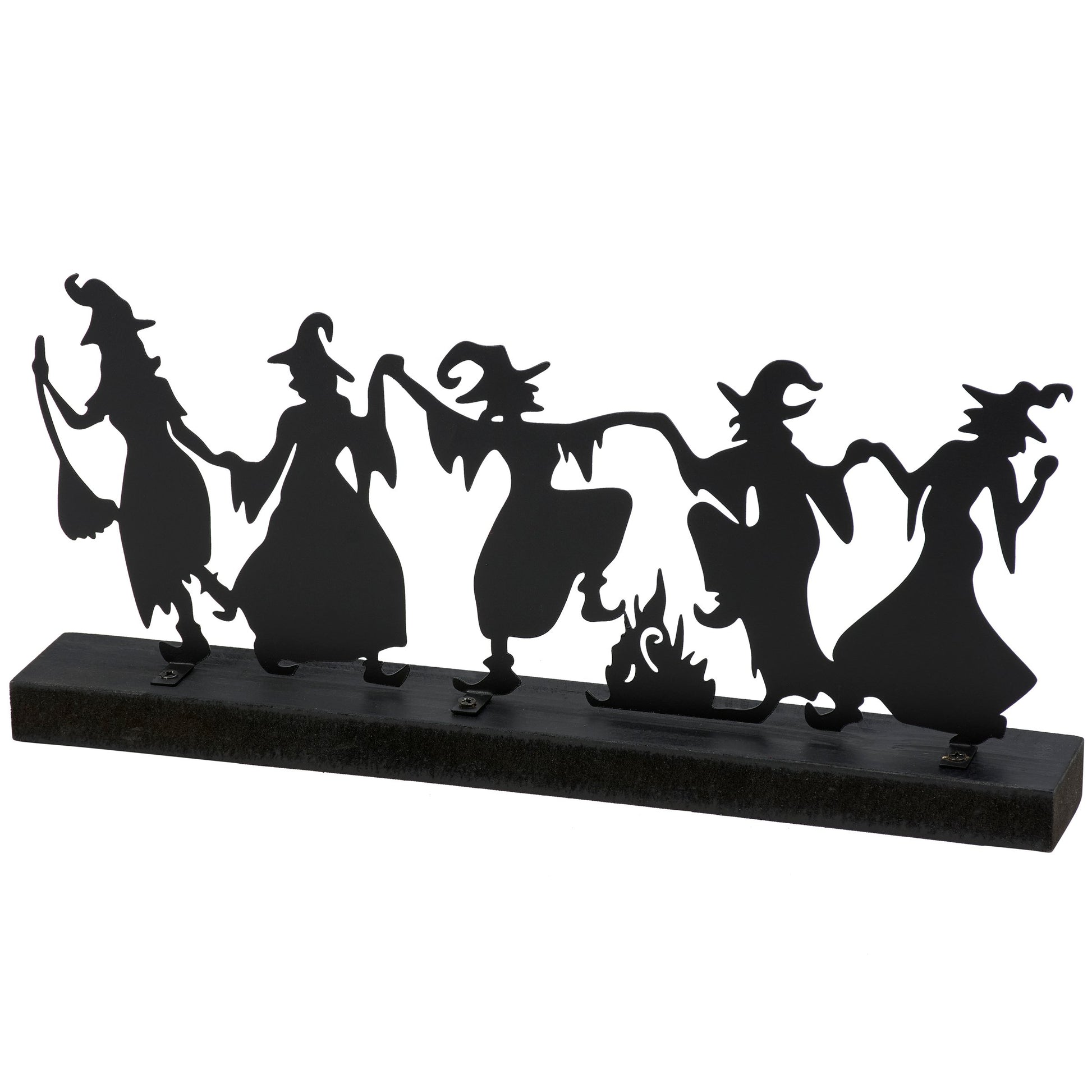 A decorative sitter from our Halloween Collection featuring a black metal cutout of witches dancing around a fire attached to a coordinating black wood base. Our Dancing Witches sitter is designed to free-stand on a flat surface for easy display. A vintage Halloween home accent that can be easily displayed in any home or workspace.
