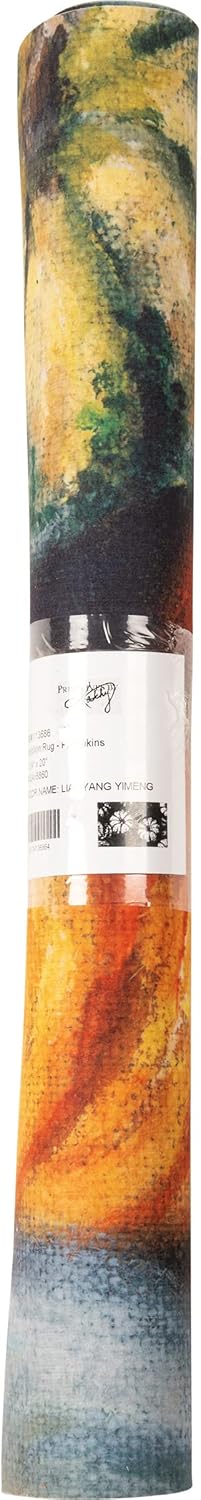 A polyester rug from our Fall & Harvest Collection featuring colorful pumpkin designs and skid-resistant PVC backing. Design is replicated from the original artwork painted onto burlap canvas, giving the art a unique depth and texture. The rug is neatly rolled with a tag featuring the full design. Our Pumpkins rug is intended for indoor or sheltered outdoor use. Spot cleaning is recommended.