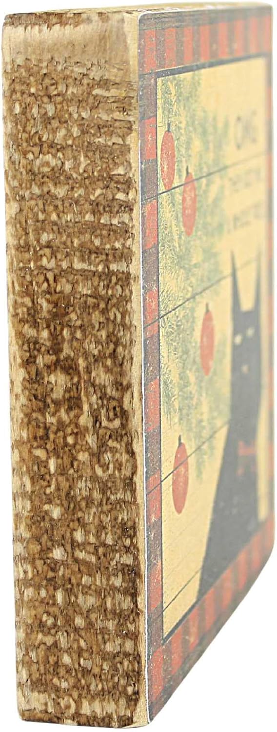 A wooden block sign from our Holiday Pet Collection displaying a rustic holiday design of a sassy cat staring at Christmas ornaments with a fun pet-inspired sentiment that reads "OMG - They Got Me A Whole Tree." Seasonal cat block sign features distressed details with coordinating natural wood on the sides and back. Our Whole Tree block sign is easy to hang via predrilled keyhole slot or can free-stand alone. A fun pet-themed home accent perfect for gifting to cat lovers.