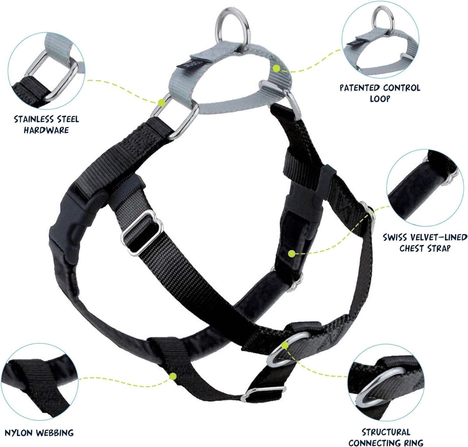 - The Freedom No-Pull Harness -- the ultimate training tool featuring a martingale loop on the back of the harness to tighten slightly around your dog's chest and discourage pulling - and a connection in the front that allows you to redirect attention back to you.