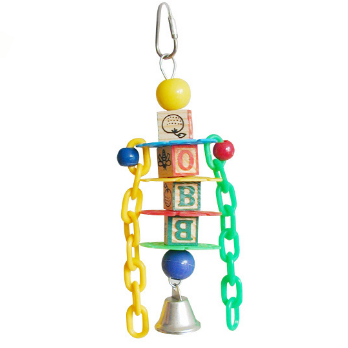 A&E Cage Company Happy Beaks Petite Learning Blocks Assorted Bird Toy has so many things to keep your favorite bird entertained. There are chains for climbing, blocks for beak conditioning, beads for playing with, a bell to make music. So many textures and colors to keep your birds attention and keep them entertained!