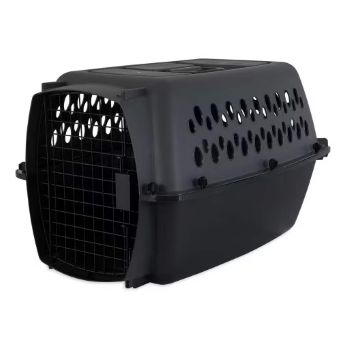 Features heavy-duty plastic shells created with eco-friendly plastic and a durable wire door to keep your dog securely contained. Side and back ventilation holes to promote healthy airflow. A floor perimeter moat to keep your dog dry. The convenient storage compartment is perfect for stowing pets travel accessories. Top and bottom shells lock together securely with front, back, and side latches. Meets most air travel requirements.