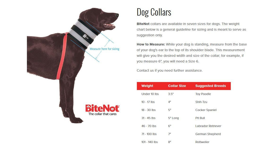 BiteNot pet collar the bitenot collars are an excellent alternative to the traditional Elizabethan collar. It provides unimpeded peripheral vision and allows them to eat, drink, sleep and play while protecting back, rump, base of tail, flanks, chest, abdomen, and genitals (even feet in small breeds). These collars are not recommended for protecting eyes or ears. These collars are made of flexible plastic and foam and are machine washable helping you easily keep it clean. They are the only cervical restraint with a harness strap and that means these collars stay on. When choosing size, remember that the collar must stretch from behind the animal's ear to the top of its shoulder for maximum protection.