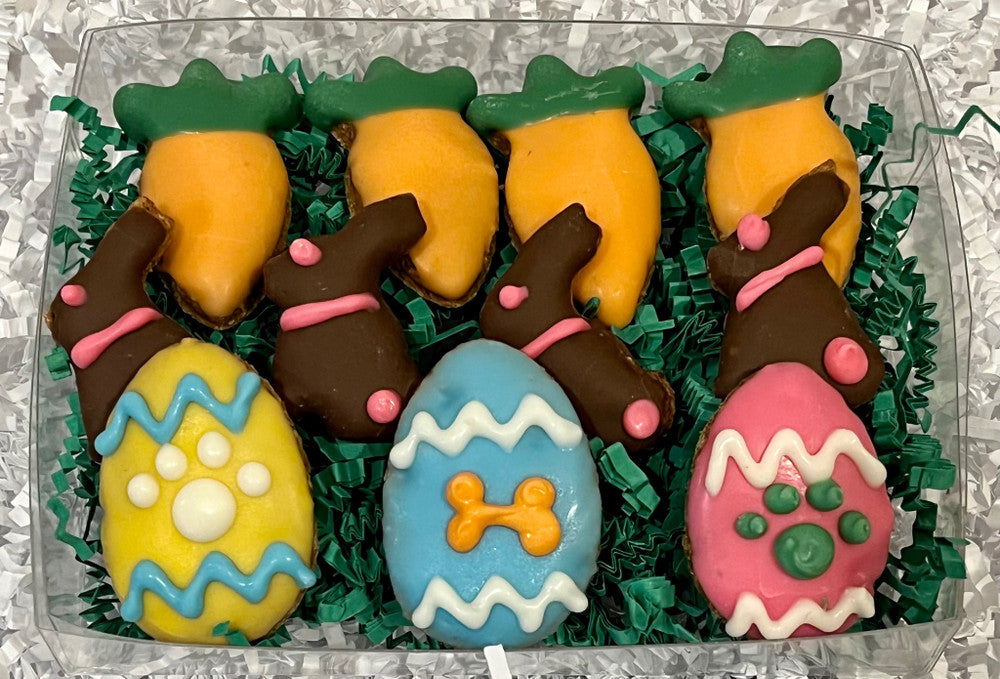 Set of Tasty dog treats! Includes an assorted Easter mini treat gift box with bite size treats for your dog! Includes 4 carrots, 3 bunnies and 3 Easter egg treats. These delicious Easter-themed dog treats are the perfect way to top off an Easter basket for your pet! They smell so good you might be tempted to take a bite! Ingredients: Peanut butter, Whole Wheat Flour, Canola Oil, Cinnamon, Oats, Eggs, Honey, Yogurt, and carob.
