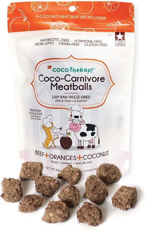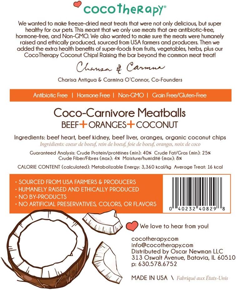 Ingredients: beef heart, beef kidney, beef liver, oranges, organic coconut chips. The ultimate freeze-dried, RAW meat treat, Coco-Carnivore Meatballs is for the perfect treat for your meat-loving pets. Not only do we use meats that are non-GMO, antibiotic- and hormone-free, but we also ensure that all our ingredients are humanely raised, ethically produced and sourced from USA farmers and producers.