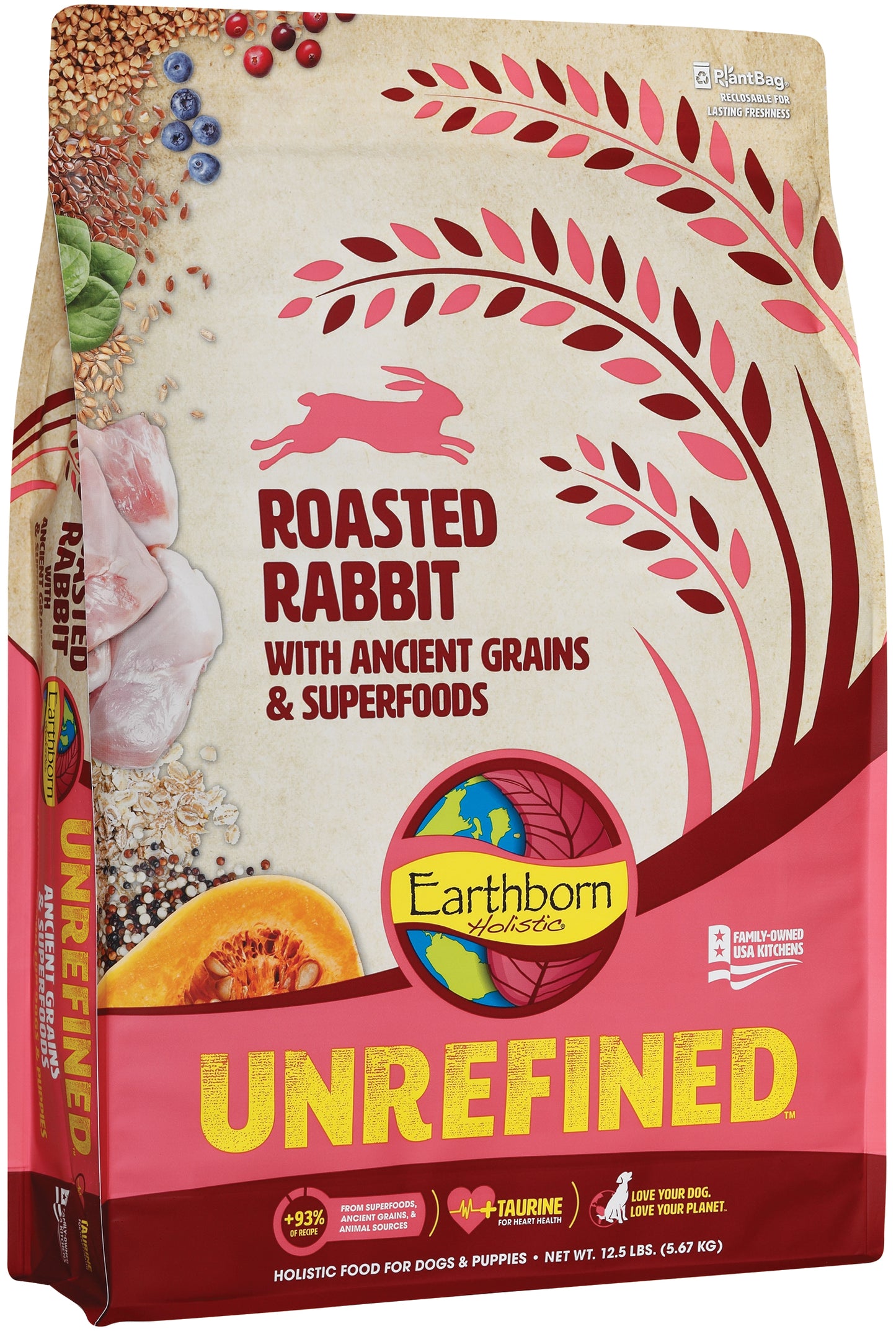 We’re on a mission to build a better bowl for your dog, so we’re going back to the basics. What makes our recipes unrefined you ask? Ancient grains were simply harvested from trusted sources including many family farms. Freshly picked superfoods for a nutritious punch. All are woven together with Roasted Rabbit for a powerful combination of protein. We broke it down and designed a recipe to meet your dog’s needs; ancient grains, superfoods and less of a mess! Join us on a pursuit for the “grainer” good and give your dog A bowl-full he will truly love, guaranteed. It’s simple, go with the grain! Only good stuff - No peas, no lentils, no legumes, no chicken, no by-products, no potatoes, no fillers, no artificial colors, no artificial flavors, no artificial preservatives.
