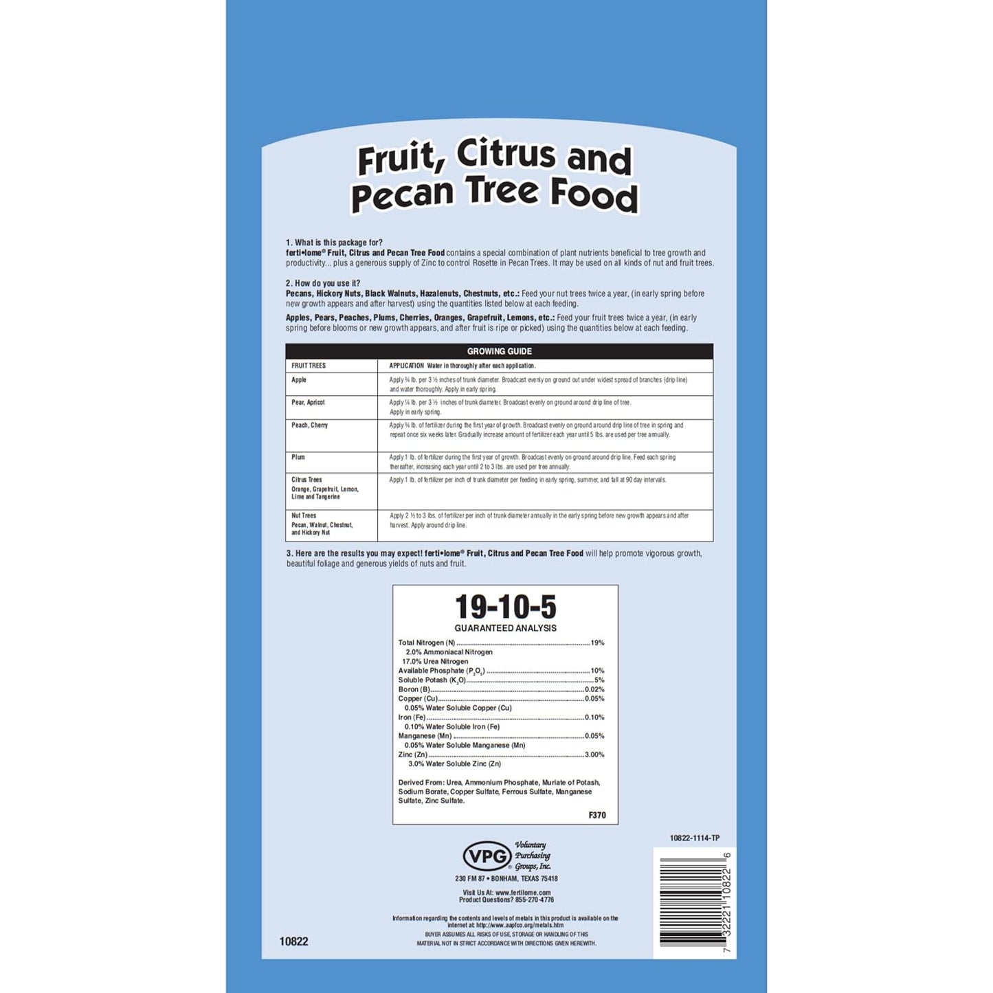 About Fertilome 10820 Fruit, Citrus and Pecan Tree Food 19-10-5 4 lbs.: Contains a special combination of plant nutrients beneficial to tree growth and productivity, plus a generous supply of zinc to control rosette in pecan trees. It may be used on all kinds of nut, citrus and fruit trees. Application Rate:Feed trees twice a year at recommended rates listed on label around the drip line and water in thoroughly. About Fertilome: Made by VPG Inc., in Bonham, Texas, USA, we have existed to strengthen, empower and support locally owned merchants and specialize in giving your green thumb a hand.
