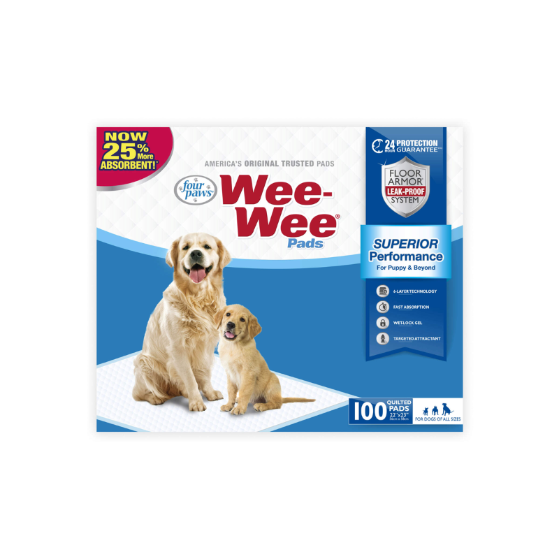 Four Paws Original Wee-Wee Pads use a leak-proof 5-ply Floor Armor system, protecting your home and making housebreaking to be much easier. Wee-Wee Pads are 100% guaranteed to resist leakage and are perfect for handling your puppys potty training.