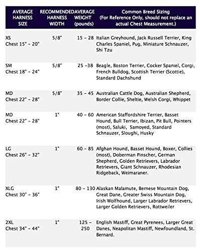 Size: Large Color: Black/Silver The Wiggles Wags & Whiskers patented Freedom No Pull Training Package has everything you need to train your dog to walk easily on a leash. Constructed of industrial strength nylon webbing with reinforced X-stitching it provides you with the security of knowing this harness will stand up to daily use by even the strongest dogs. The training package includes: 1. The Freedom No-Pull Harness -- the ultimate training tool featuring a martingale loop on the back of the harness to tighten slightly around your dog's chest and discourage pulling - and a connection in the front that allows you to redirect attention back to you. 2. A Coordinating Training Leash which can connect to the front and back of the harness simultaneously or to the back of the harness and a collar at the same time for additional control. 3. Training instruction brochure. 4. Fitting instructions and Warranty Information. The harness has a contrasting loop (which can be seen in the photos) to make it easier to put on and take off. Sizing information: Use a soft tape measure (tailor's tape measure) or a piece of string or ribbon mark the measurement around the chest and then measure the string from the end. Chest and neck measurements and weight recommendation: X-Small: Chest - 14"-20"; Neck - 10"-14"; Weight - 12-17 lbs. Small: Chest - 18"-24"; Neck - 10"-14"; Weight - 18-25 lbs.Medium (5/8" width): Chest - 22"-28"; Neck - 14"-18"; Weight - 25-40 lbs.Medium (1" width): Chest - 22"-28"; Neck - 14"-18"; Weight - 40-65 lbs.Large: Chest - 26"-32"; Neck - 16"-20"; Weight - 60-85 lbs.X-Large: Chest - 30"-38"; Neck - 20"-26"; Weight - 85-140 lbs.2X-Large: Chest - 36"-44"; Neck - 26"-34"; Weight - 140-250 lbs.