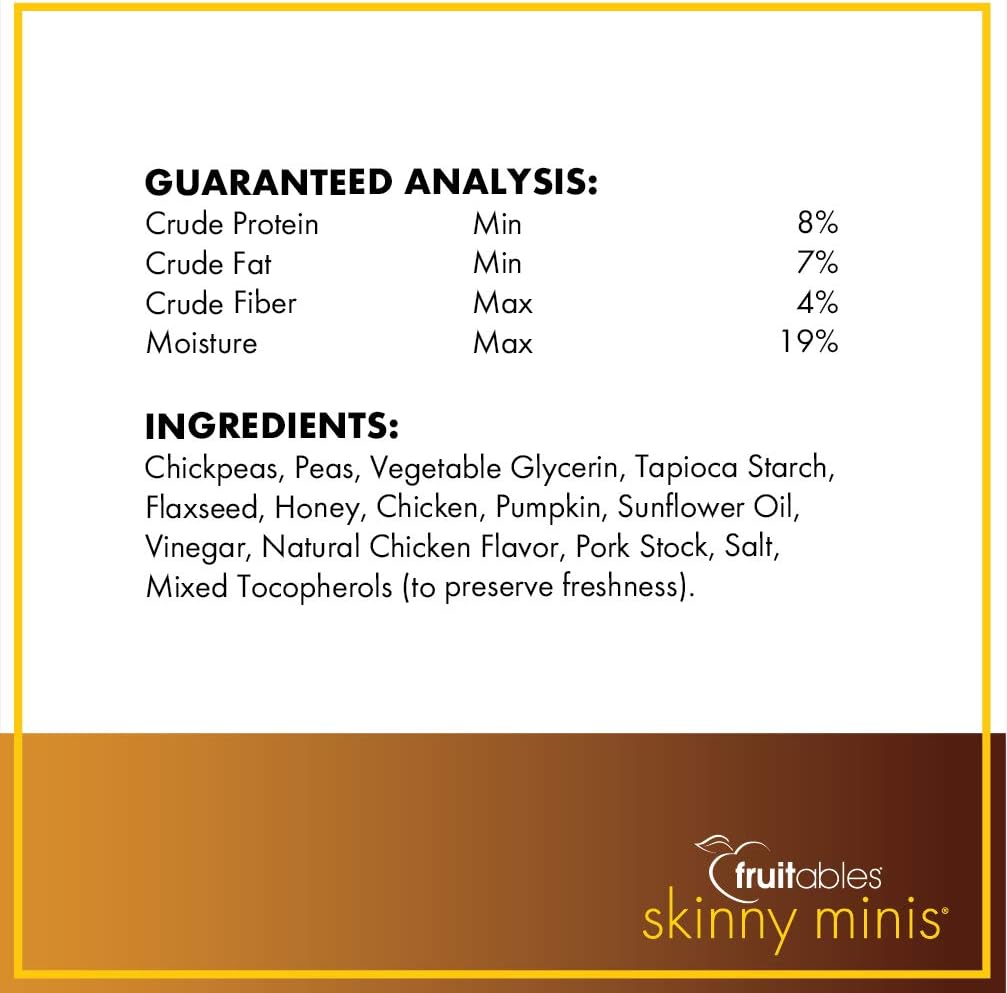 Open a bag of Fruitables treats and you will immediately smell the difference. At Fruitables, they make treats that taste as good as they smell. The smell and taste of a slow-roasted chicken with its caramelized juices and tender texture is everyone's favorite. These Skinny Minis combine that same great taste & aroma in a calorie smart pumpkin recipe that is perfect for everyday treating. Fresh from their certified organic bakery, Fruitables treats come in different textures and a variety of flavors as broad as the rainbow - go ahead, explore the deliciously healthy world of Fruitables!