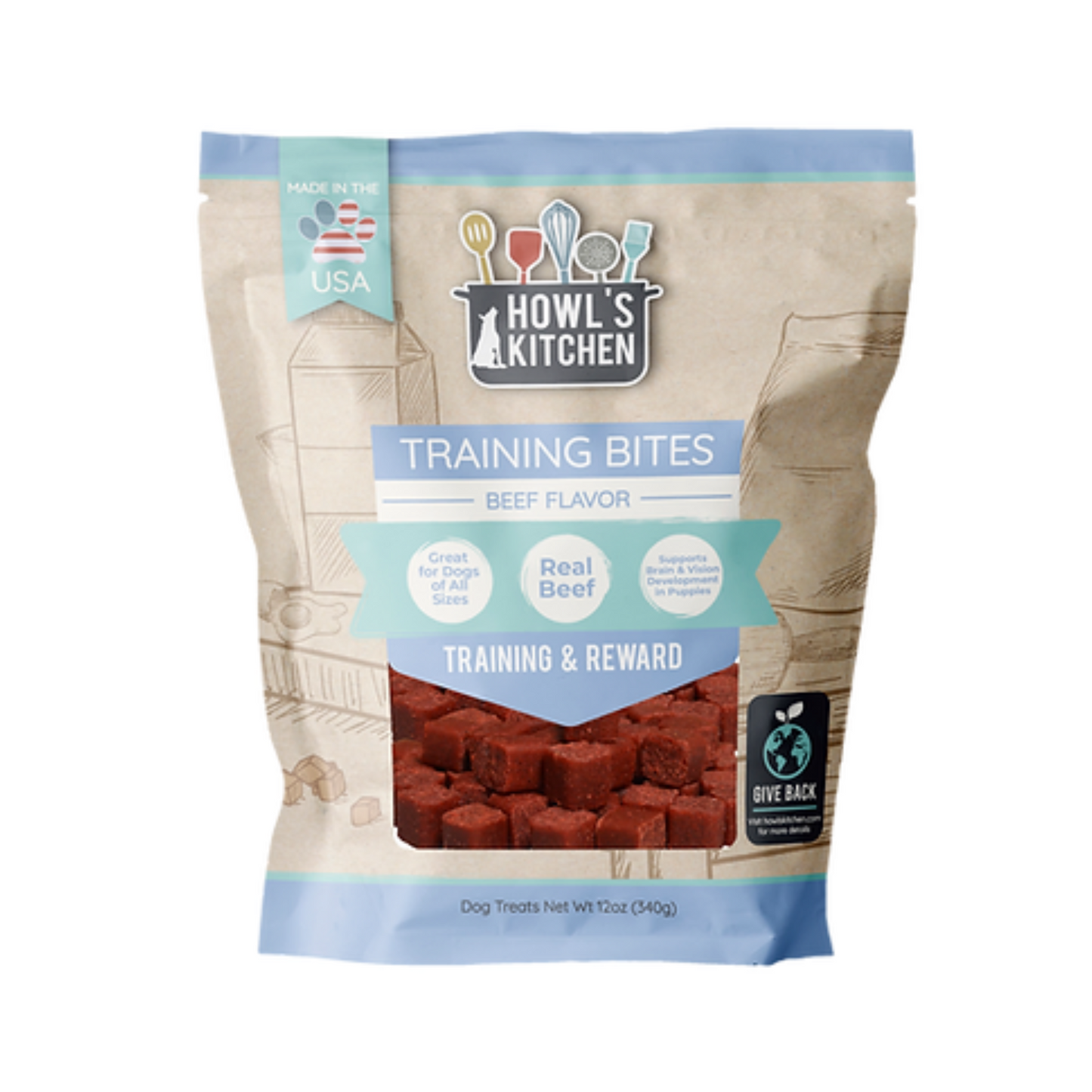Howls Kitchen Training Bites are irresistible dog treats made with real beef that provide premium protein for strong muscles. These soft, moist snacks are also packed with DHA to support healthy brain and vision development in puppies, and they're the perfect size for regular training.