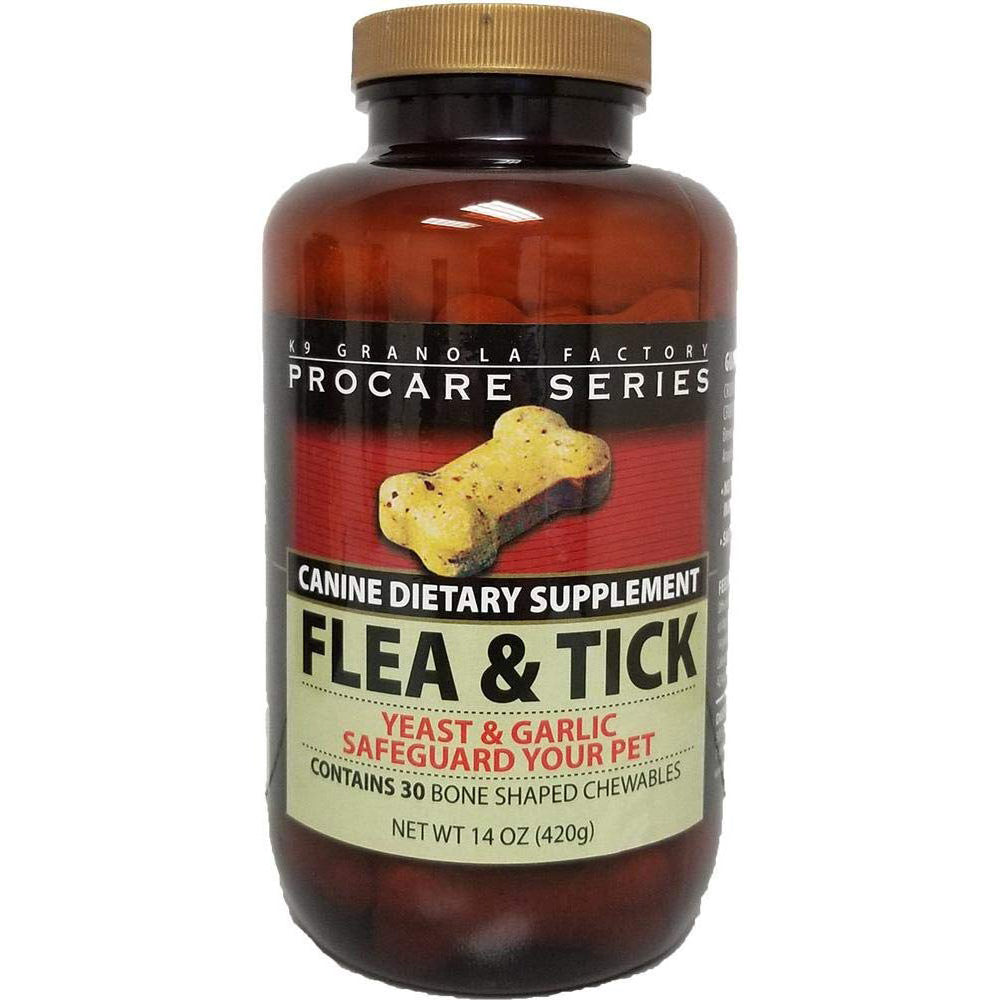 100% Organic No Chemicals Safe for Daily Use K9 Granola Flea and Tick Chewables are a natural way to rid your dog of pests. Now you can avoid the dangerous chemicals found in other flea and tick treatments and go with the 100% Organic Treatment from K9 Granola Factory. Fleas and Ticks find the scent of Brewers Yeast and Garlic repulsive. It works by creating a light body scent that the pests can smell. Garlic will also improve your dogs immune system and pests usually go after a weaker host, leaving your dog with less chance of being a target. Feeding Instructions Per Day: 10-49lb.= 1/2 Bone / 50-99lb.= 1 Bone / 100+ lb. = 2 Bones Ingredients: Dried Organic Whey Protein Concentrate, Organic Brewers Yeast, Organic Garlic Powder, Organic Whey Powder. Size: 4oz. 60 count Guaranteed Analysis: Crude Protein Not Less Than 35% Crude Fiber Not More Than 5% Crude Calcium Not More Than 4.5%