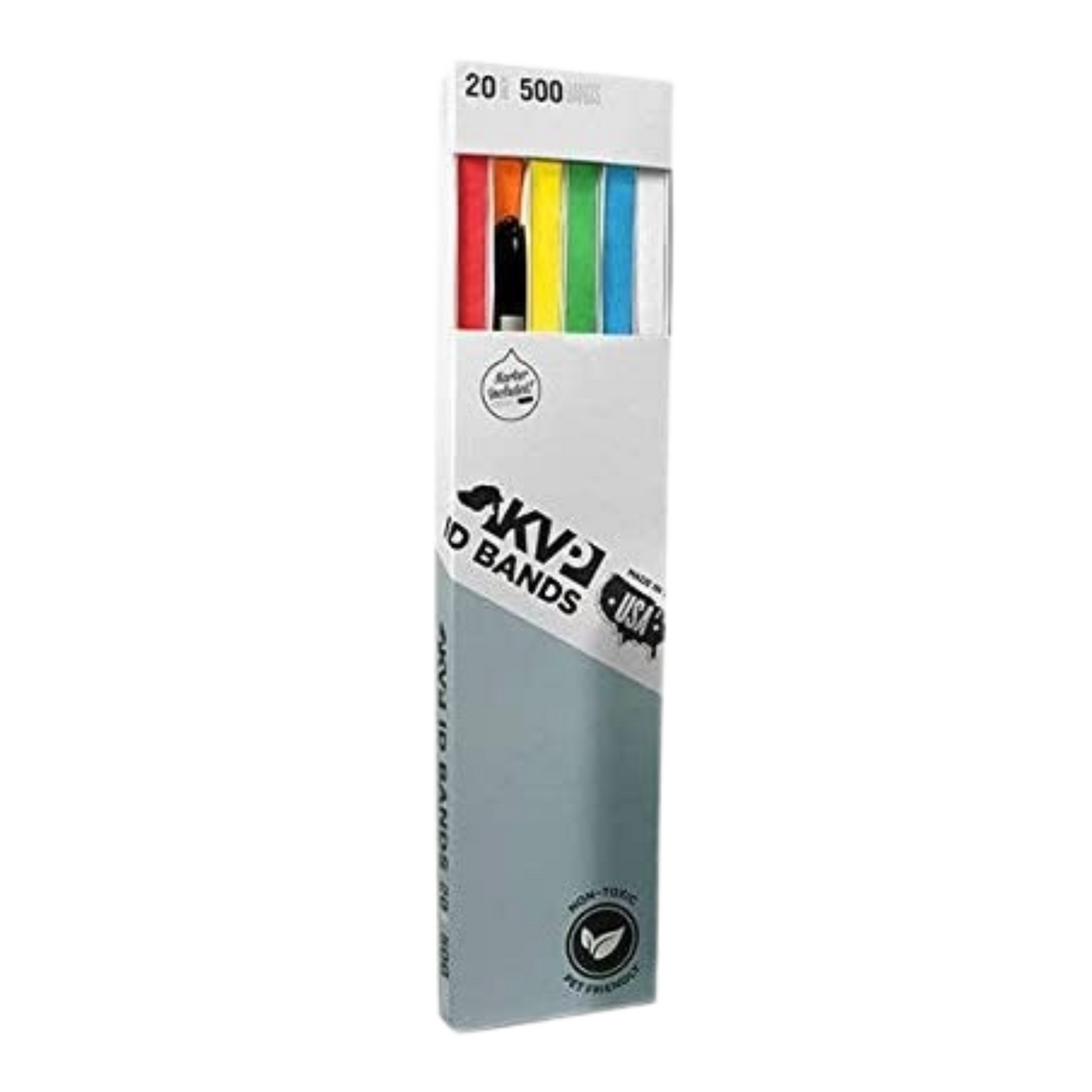 KVP pet 500 count ID bands, 20", blue. Strong, pressure-sensitive adhesive becomes more permanent with increased pressure. Available in 6 colors and a range of sizes. Perfect for whelping and knowing who's who in your puppy litter. Available in 2 sizes with 500 bands in each one! Make your whelping season easier with color-coded ID bands.