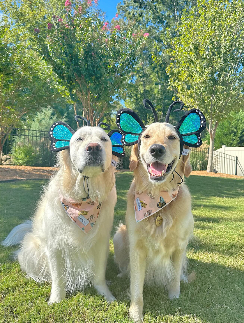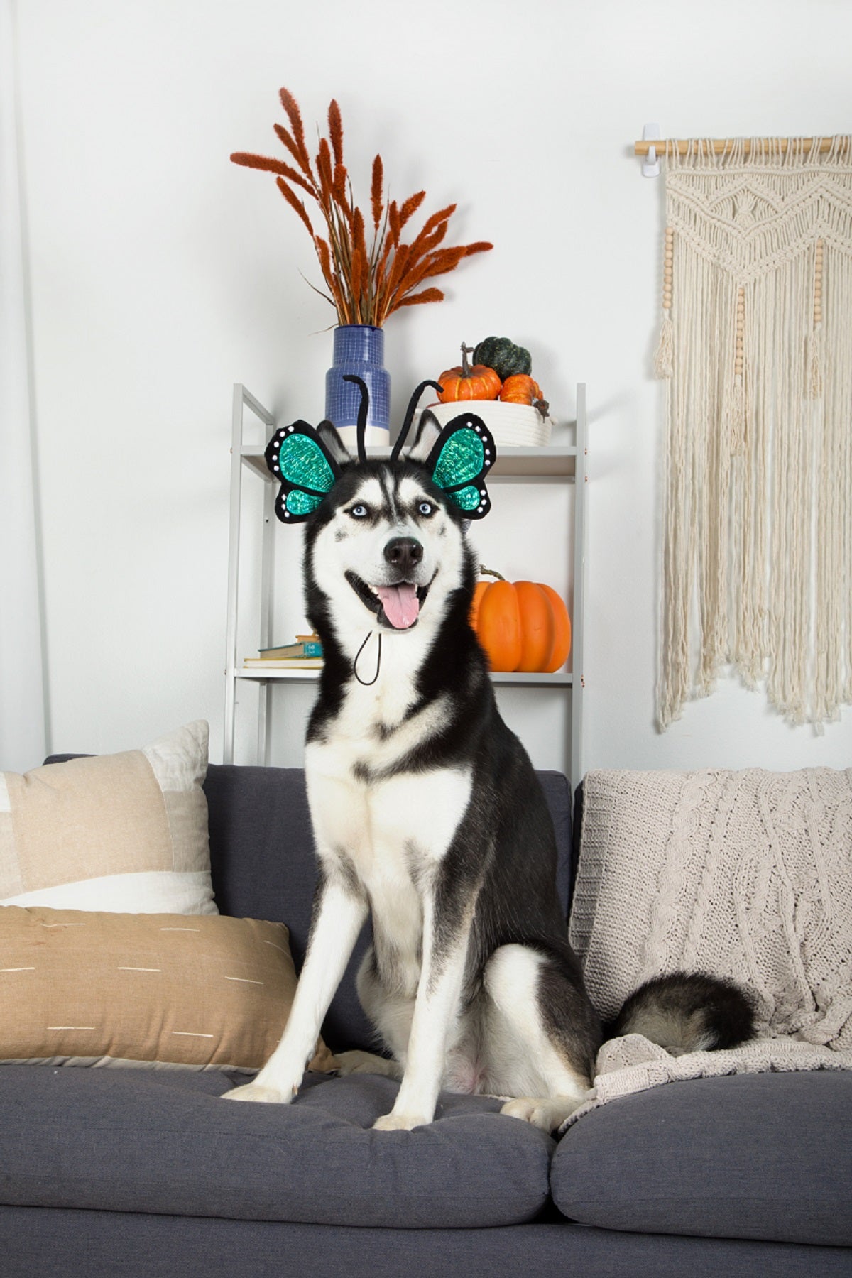 Shimmering blue butterfly wings with an antenna. Best for medium to large-sized dogs. Dress up your pet as a butterfly this Halloween with this simple costume! Whether you are looking to use it on its own or in a matching set, this adorable headband will be a hit! Includes a butterfly headband featuring an adjustable chin strap that stretches from 4" to 8" in diameter. Your dog will look like the most beautiful butterfly in the garden with this headband!