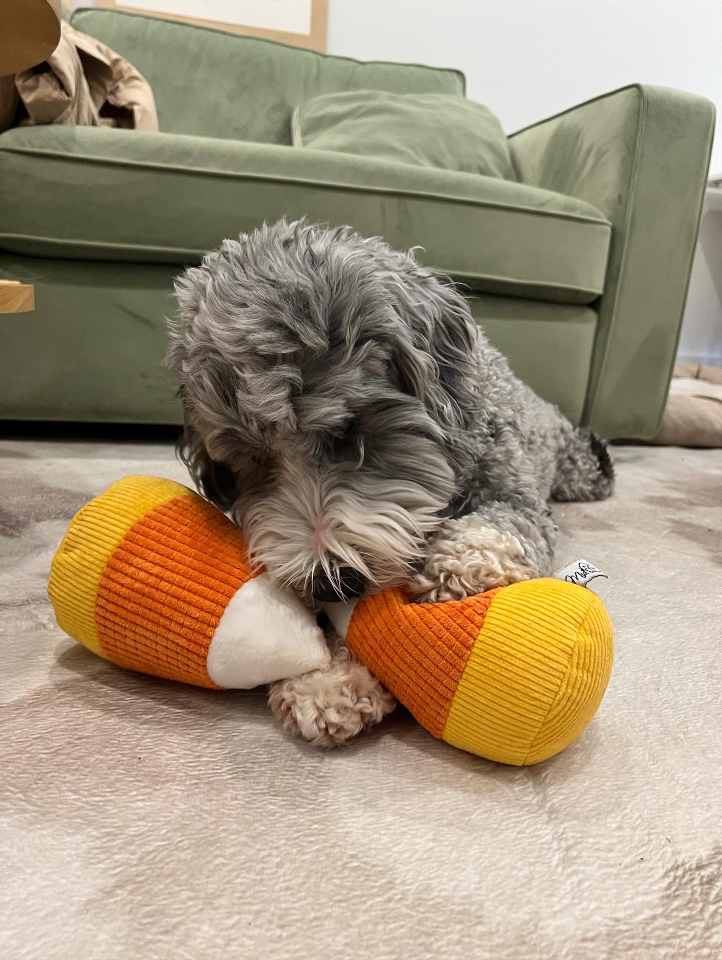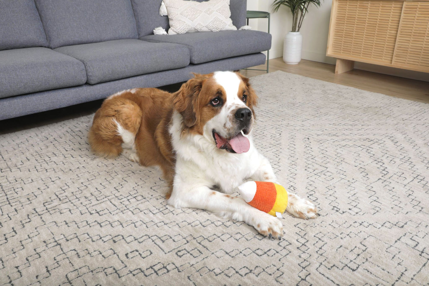 Plush candy corn dog toy with corduroy fabric. Comes in a pack of two. Each has large squeakers inside for an exciting time! Perfect for any sized dog - each candy corn measures 7" x 5." Stuffed to the brim with polyfill and a squeaker, this toy is not for destructive chewers! Three different textures make up each color on this toy. Your pet will love playing, cuddling, gnawing, and fetching these adorable toys!