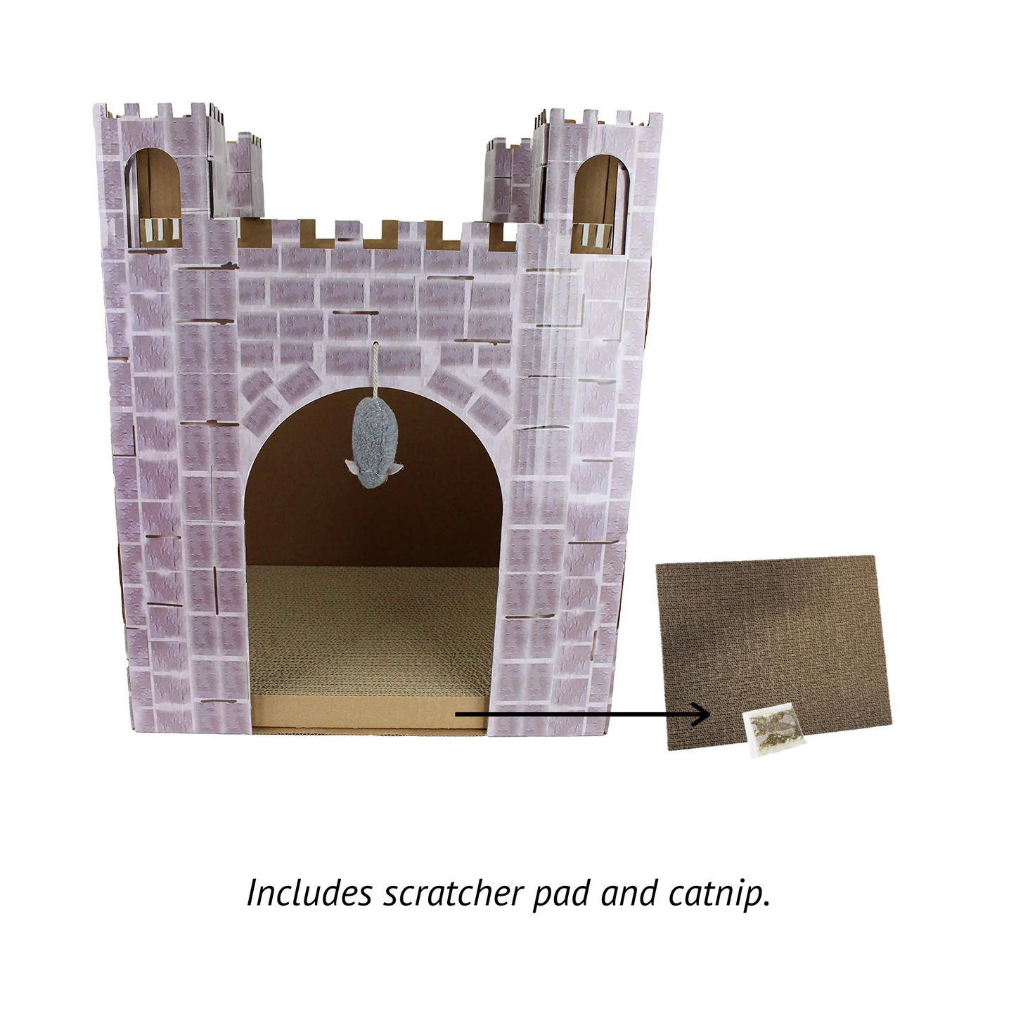 A castle for the king or queen of the house! This cat scratcher stands approx. 20" tall and is 16" wide and 13" deep. Comes with a removable scratchpad (that sits perfectly inside), a hanging mouse toy, and a small bag of natural catnip. The door opening is approximately 11" tall by 8" wide. Great for your kitty or any cat lover in your life! Ships flat and assembles easily.