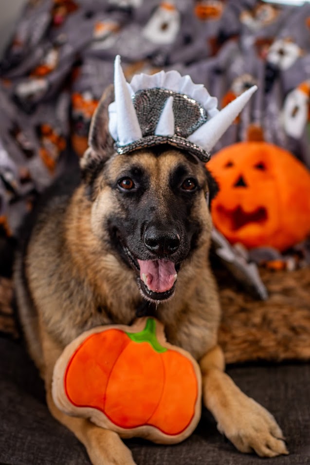 Silver and black triceratops dinosaur dog Halloween costume! Best for medium to large-sized dogs. Dressing up as an archeologist or fellow dinosaur this Halloween? This costume is for you! Includes a holographic silver and black headband featuring 3 horns and spikey scales. The headband stretches from 4" to 8" in diameter and has an adjustable chin strap to best fit your pet! This costume also comes with a spikey tail attached with an elastic band (which is extra long and can be tied in a knot to fit your pet comfortably around their mid-section). Your dog will transport you back in time 70 million years to when dinosaurs roamed this planet!