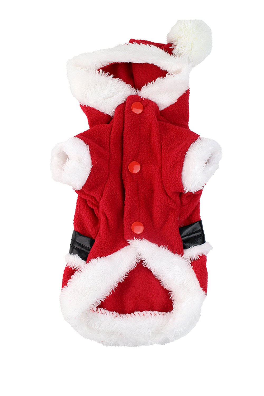 This adorable Santa Claus dog costume is made from a vibrant red fabric and lined with fleece to keep your pet cozy and warm. There's fur trim on the sleeves, hems, and hood as well as a faux leather belt with a stylish plastic gold buckle.