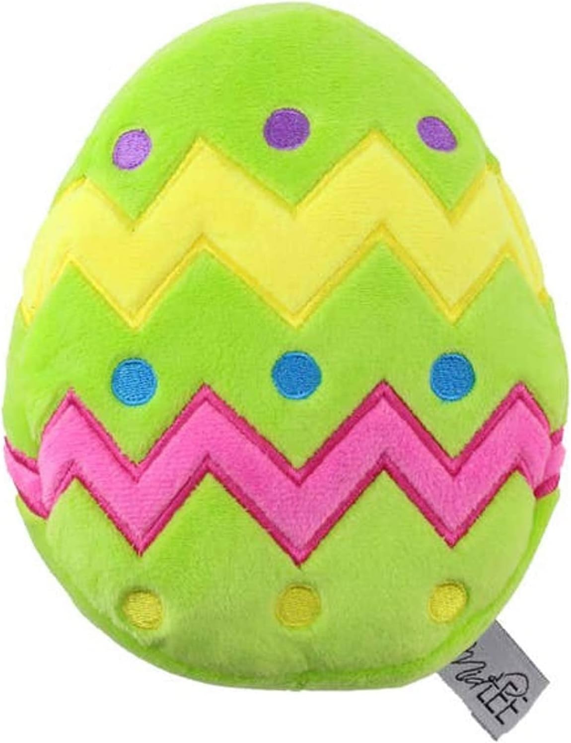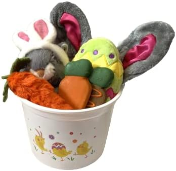 Includes 5 Easter-themed items in a colorful white plastic Easter basket. Three plush toys, one large bunny squirrel and one 6" plush Easter egg toy with embroidered decorations, and one plush carrot toy with squeaker. Two Easter carrot treats. Made in the USA. One gray and pink rabbit ears headband that stretches from 4" to 8" wide in diameter. Good for large dogs. This basket comes with a selection of toys, treats, and an Easter bunny headband.