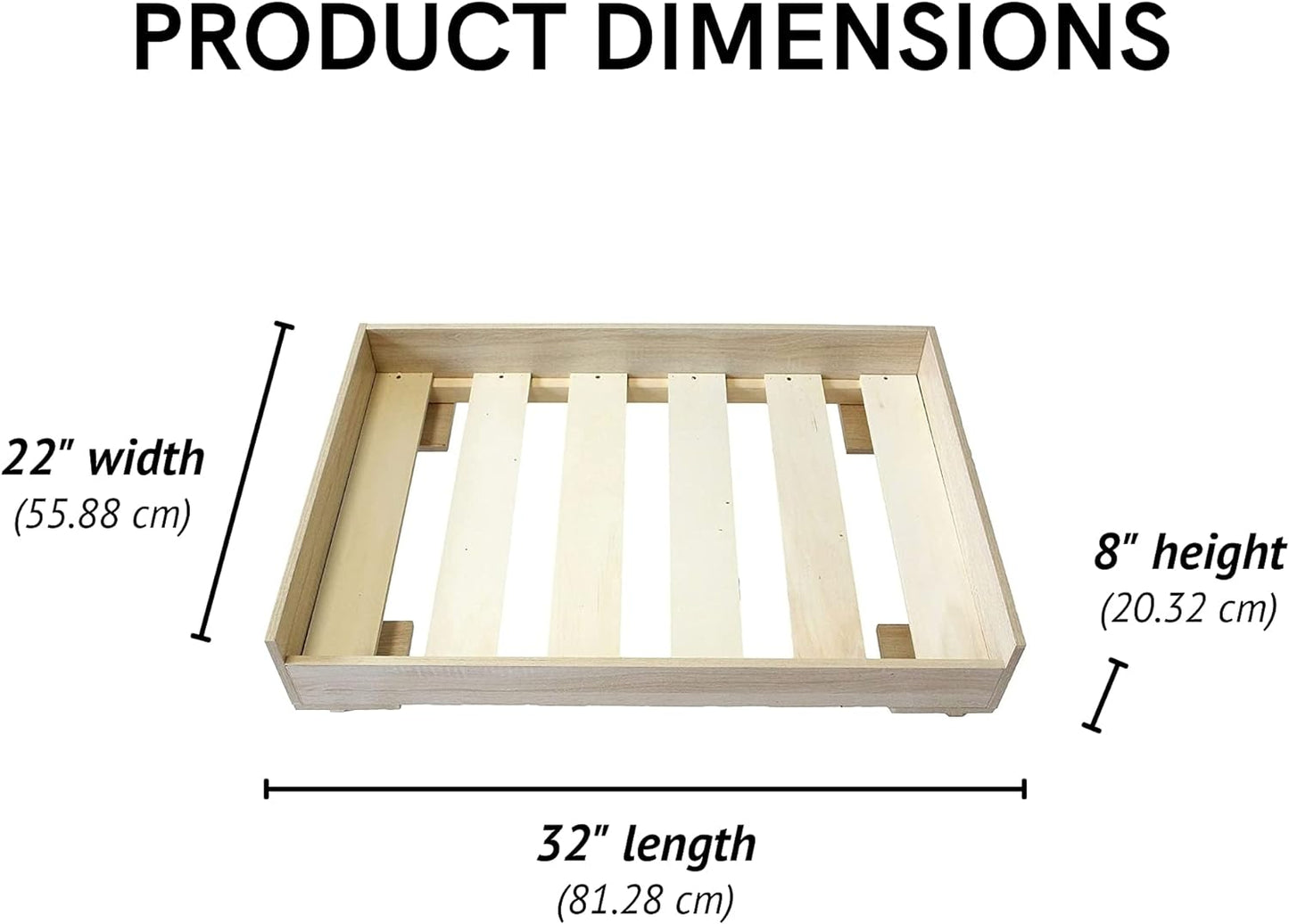 Get your dog's favorite bed off the floor and keep them comfortable all night long with the Midlee Raised Wooden Dog Bed Frame. The modern design of this elevated dog bed will fit right into any home's decor. Includes a smooth, light wood shade/color and is made from Poplar wood. The frame is easy to clean, just wipe with soapy water and dry off with a clean towel. Ships flat. Assembly required. Tools included. Bed and/or pillow is NOT included. Overall dimensions: 32"L x 22"W x 8"T. Front edge is 6.75" off the ground. Interior dimensions for bed: 21" x 31". Bed/pillow not included.