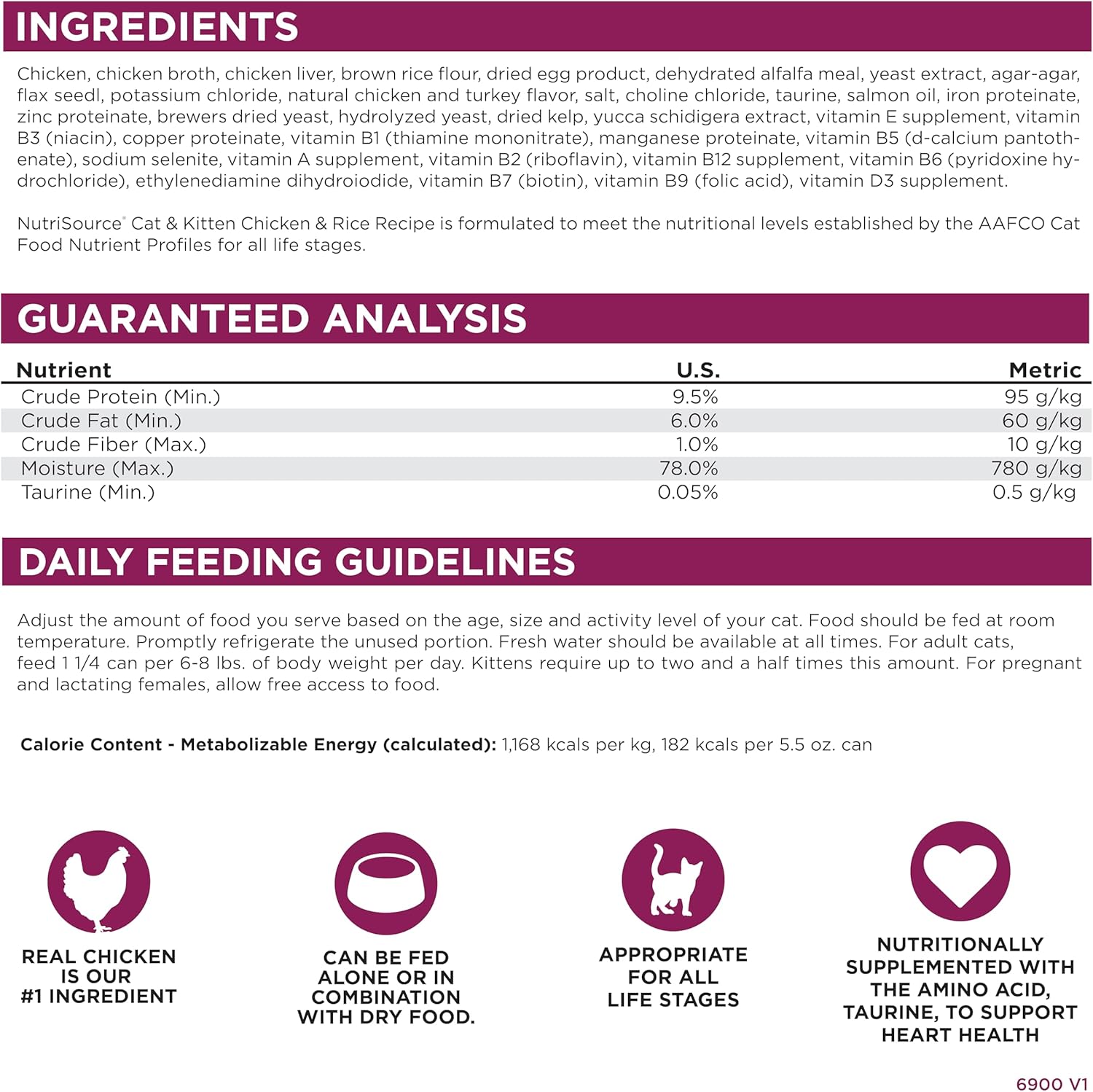 NutriSource Cat and Kitten Chicken Chicken and Rice Canned Cat Food is an easy-to-digest pate your cat is sure to love! This recipe also has added prebiotics and highly digestible minerals for immune and growth support. Nutrisource recipes always include their Good 4 Life system with ingredients that work together to promote gut health often showing health improvements within the first feeding!