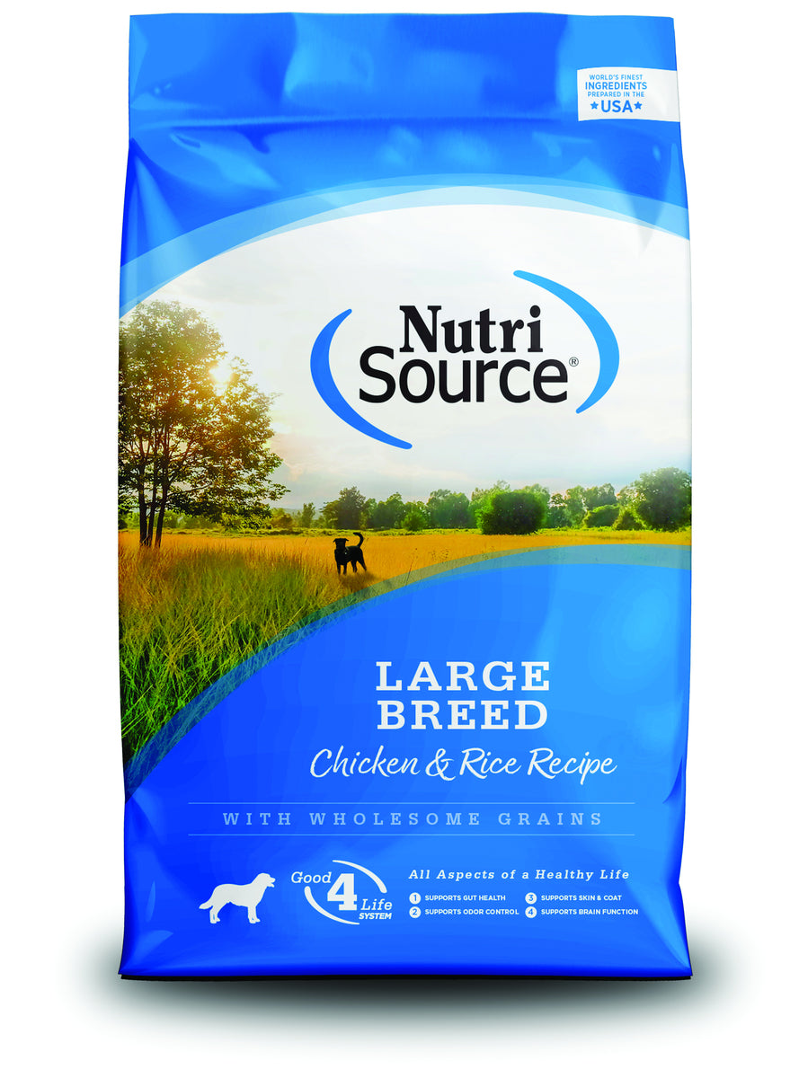 NutriSource® Large Breed Chicken & Rice Recipe Dog Food is a scientifically formulated, easy-to-digest food. Real chicken is the number one ingredient. Chicken has rich, wholesome taste dogs love and is a source of high-quality protein that helps maintain muscle mass and strength. Our blend of chicken, rice and carefully selected ingredients helps balance essential nutrients necessary for the health and well-being for your furry friend. Feed with confidence knowing that you’re part of a family that loves your pets just as much as you do. Health begins here.
