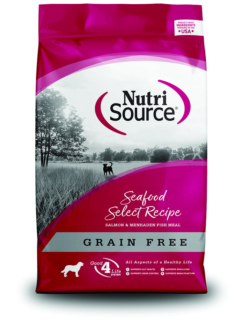 NutriSource Seafood Select Grain Free provides super premium nutrition in a scientifically formulated easy-to-digest food. Real Salmon is the #1 ingredient that features excellent palatability, digestibility, and tastes dogs love. Salmon is a source of high-quality protein to help maintain your dog's muscle mass and strength. Seafood Select Grain Free features the NutriSource exclusive Good 4 Life system and is made with the finest quality ingredients available. NutriSource Seafood Select Grain Fee combines Salmon and carefully selected ingredients in the precise blend to balance all essential nutrients necessary for optimum health, well-being and long life. Readily available nutrients in Salmon go to work on the inside, resulting in less waste.
