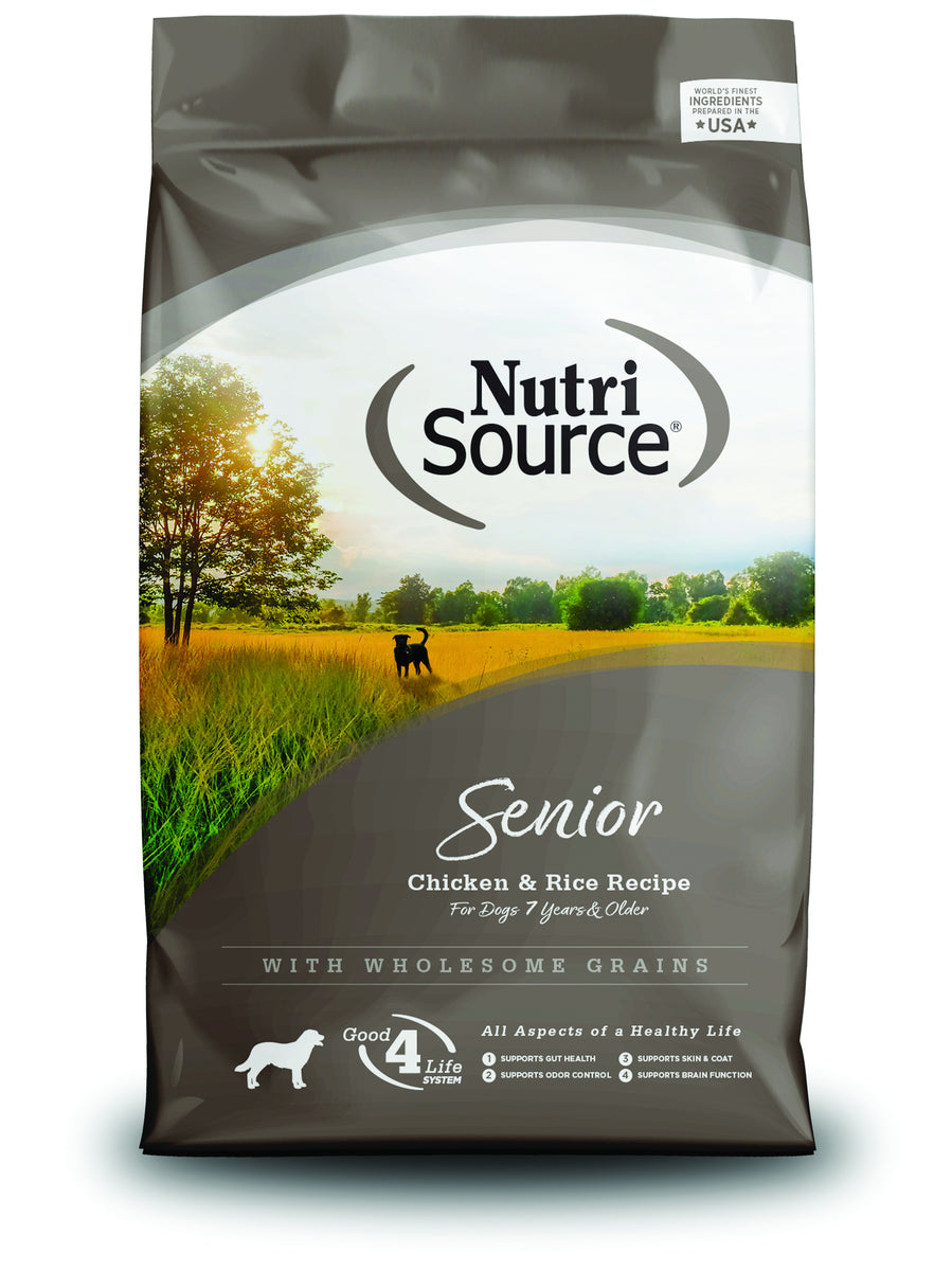 NutriSource Senior Dog Chicken and Rice Formula provides super premium nutrition in a scientifically formulated easy-to-digest food specially designed for dogs 7 years of age and older. Real chicken is the number one ingredient in NutriSource. Chicken is a source of high-quality protein; chicken has a rich, wholesome taste dogs love. NutriSource combines chicken, rice and carefully selected ingredients in the precise blend to balance all essential nutrients necessary for optimum health, well-being and long life. Readily available nutrients in chicken and rice go to work on the inside, resulting in less waste.