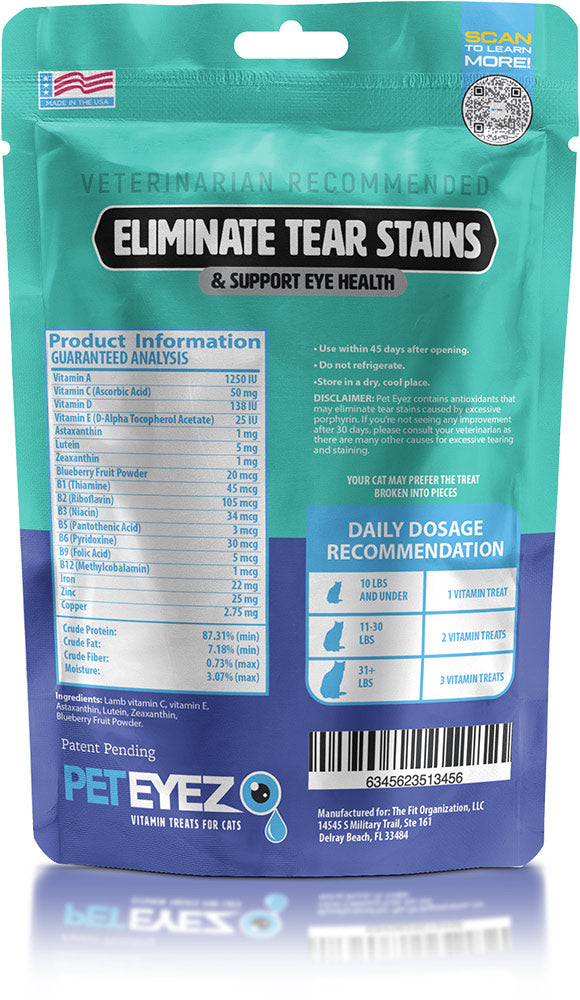 Pet Eyez is made from 18 vitamins and minerals, which include lutein, zeaxanthin, astaxanthin, and blueberry fruit extract which can help to reduce tear stains and certain ocular conditions in your pet's eyes.