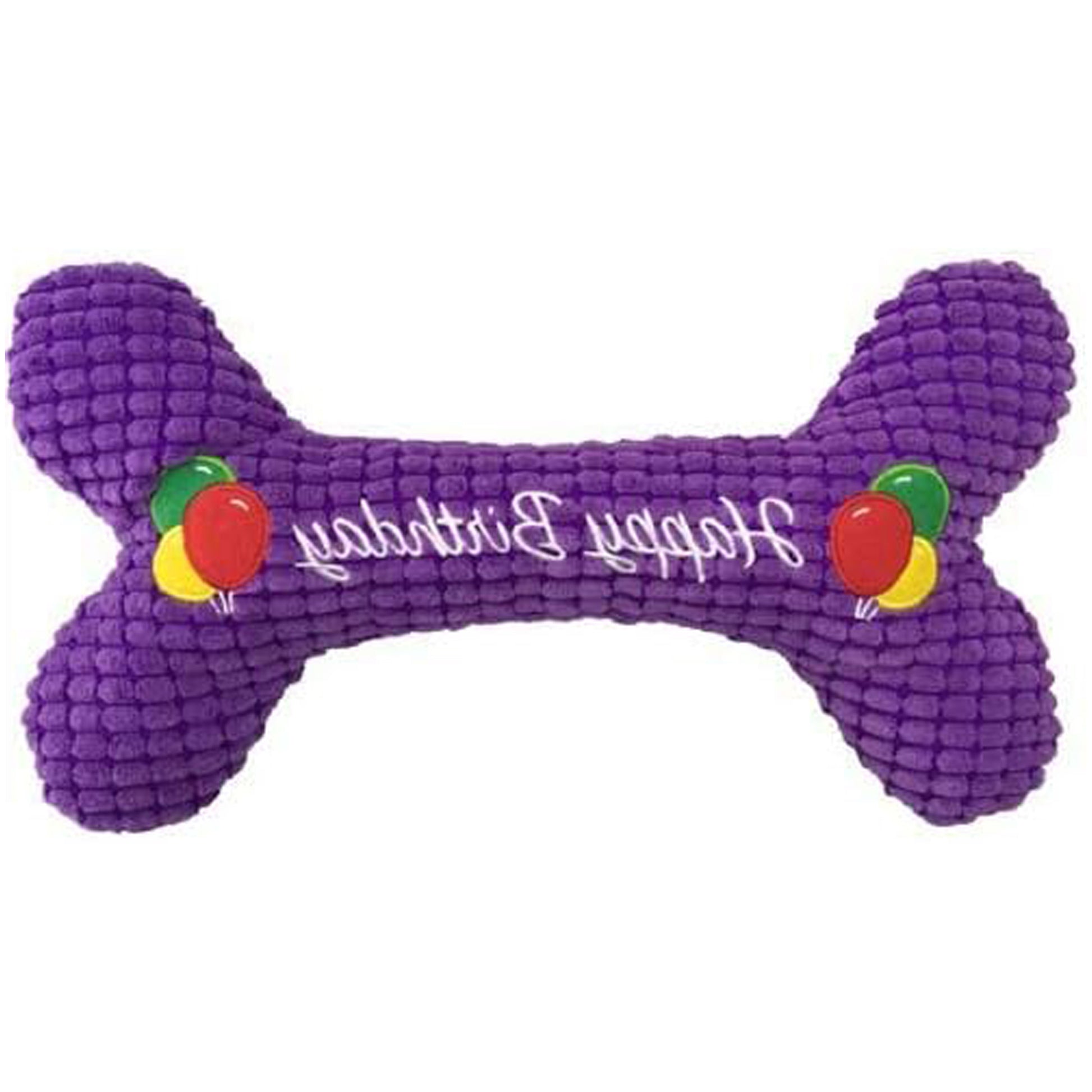16"" long bone-shaped dog toy made of purple plush with ""Happy Birthday"" and balloons embroidered for safe play