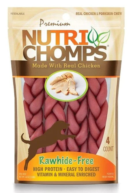 Premium Nutri Chomps Chicken Flavor Braids are rawhide-free dog chews made with real, oven-baked chicken and pork skin. Nutri Chomps chews are completely edible and fortified with essential vitamins and minerals, with a tough braid shape that provides dogs with a satisfying chewing challenge.