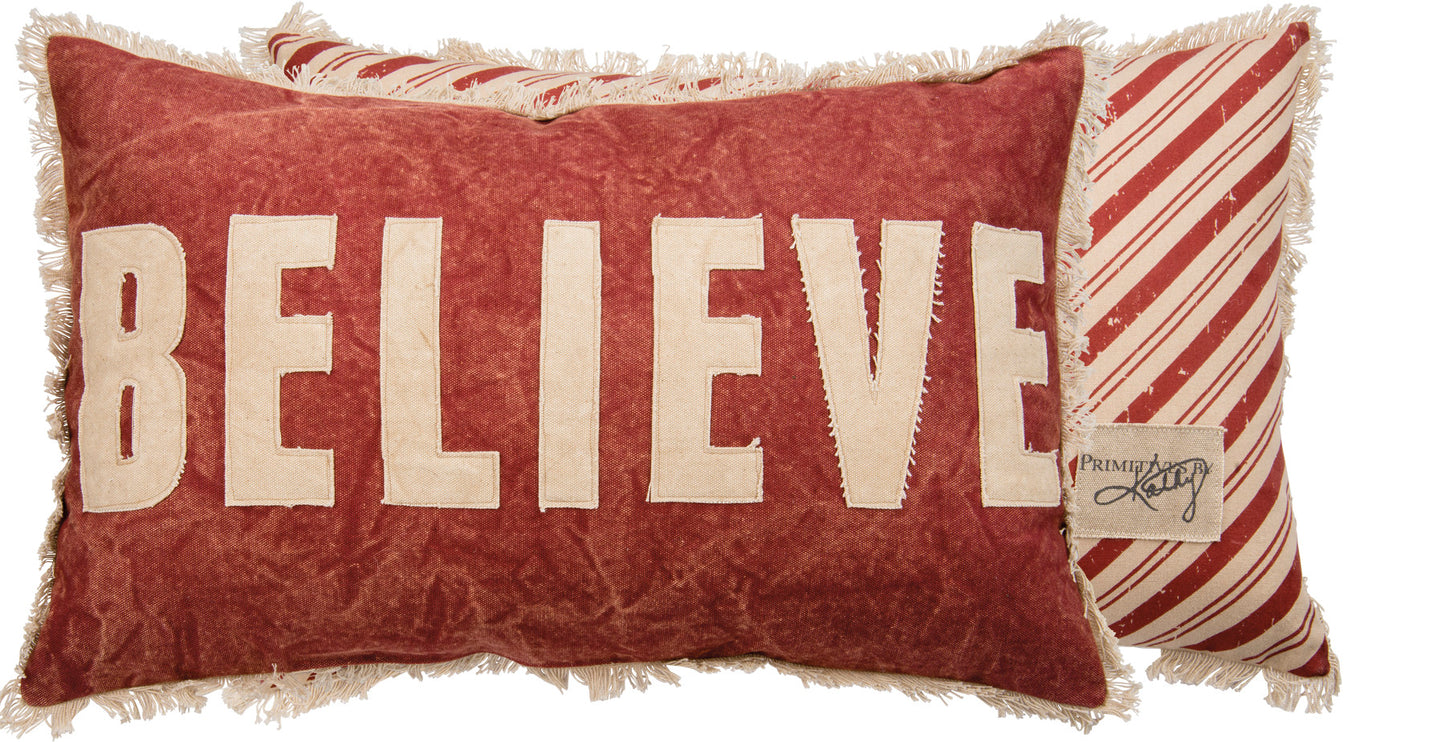 Add a touch of charm to your space with this double-sided canvas pillow featuring an appliqued “Believe” sentiment on one side and diagonal print designs on the reverse. Finished with a decorative fringe trim, it brings texture and style to any room. The pillow includes polyester filling for comfort and a zipper closure, allowing the cover to be removed easily for cleaning. Shipped vacuum-sealed for protection and convenient storage, this pillow is both practical and decorative for year-round use.