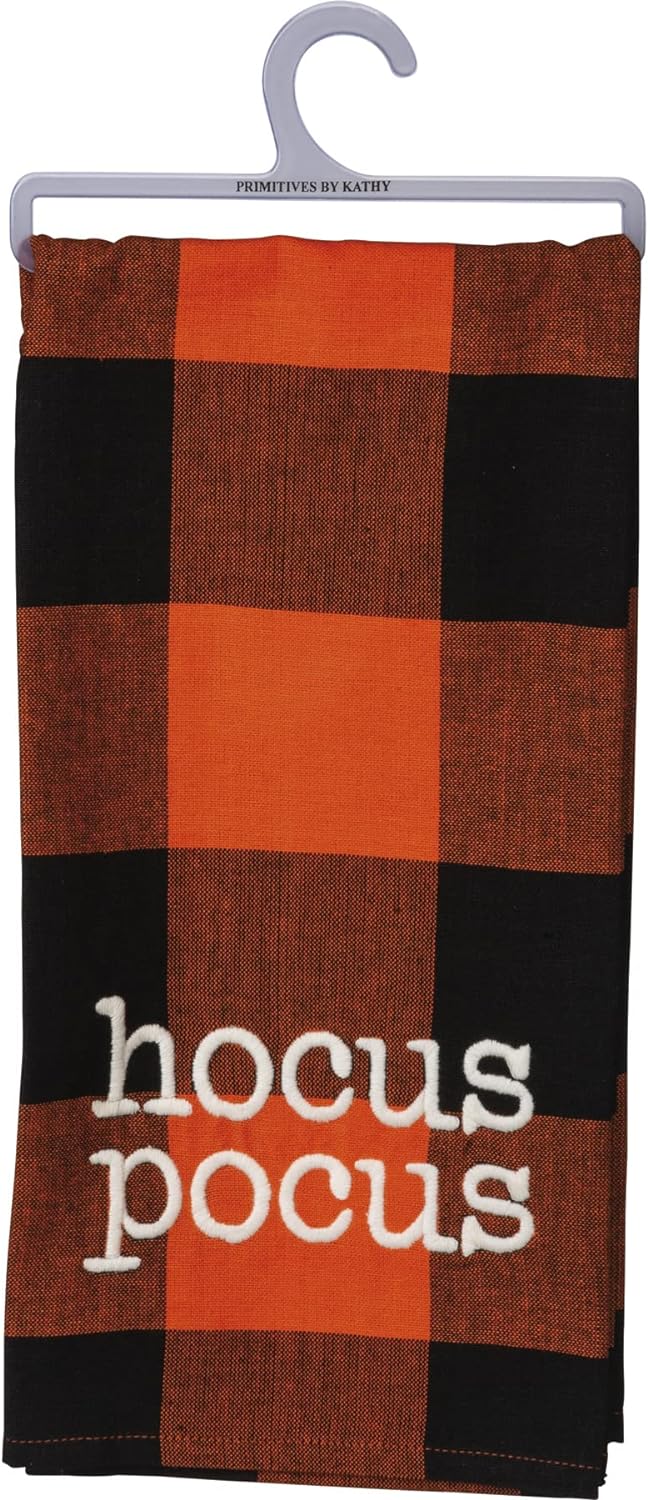 A cotton kitchen towel featuring an all-over orange and black buffalo check pattern and embroidered "Hocus Pocus" sentiment in white. Machine-washable.