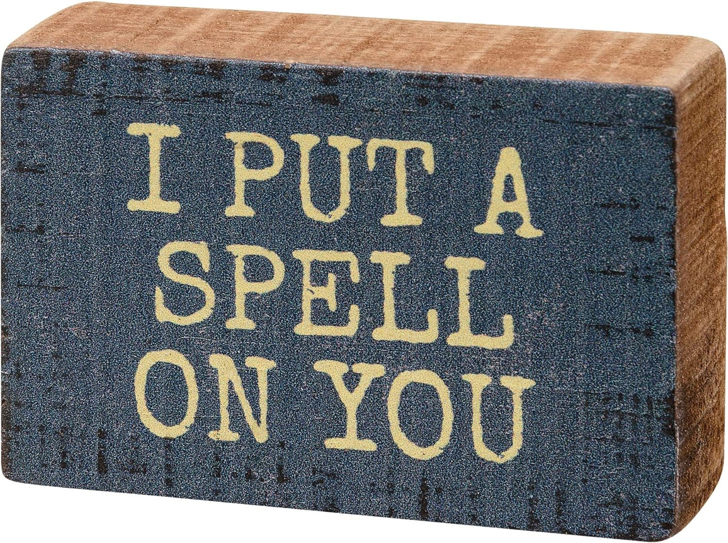 A wooden block sign featuring a textured background design and "I Put A Spell On You" sentiment. Design is replicated from the original artwork painted onto burlap canvas, giving the art a unique depth and texture. Easy to hang via predrilled keyhole slot or can free-stand alone.