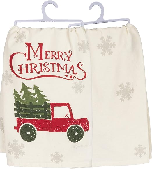 Bring a touch of rustic charm to your holiday kitchen with the Primitives by Kathy Rustic Holiday Dish Towel. This cotton towel features a distressed "Merry Christmas" sentiment with a delightful snowy truck and trees design, perfect for adding a festive touch to your kitchen decor. Complementing other rustic-inspired Christmas decorations, this towel is both beautiful and practical, being made from high-quality cotton that is machine-washable.