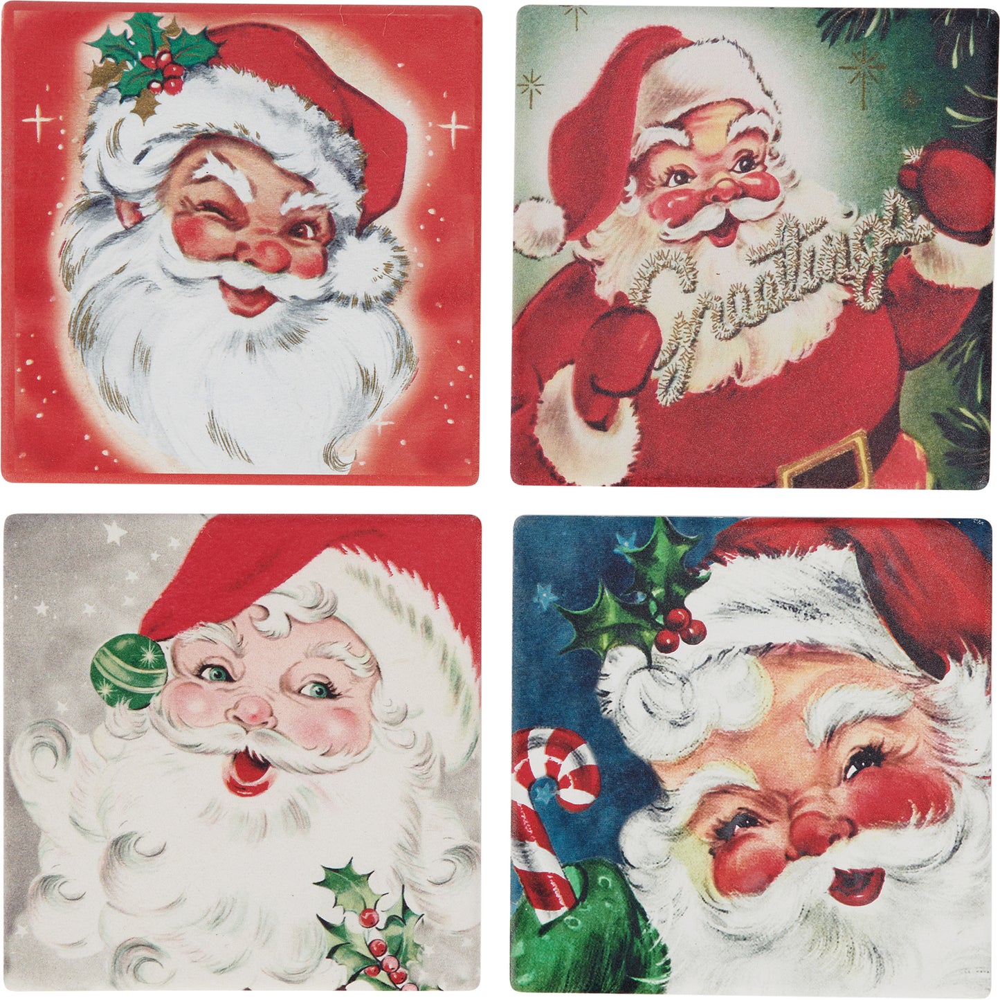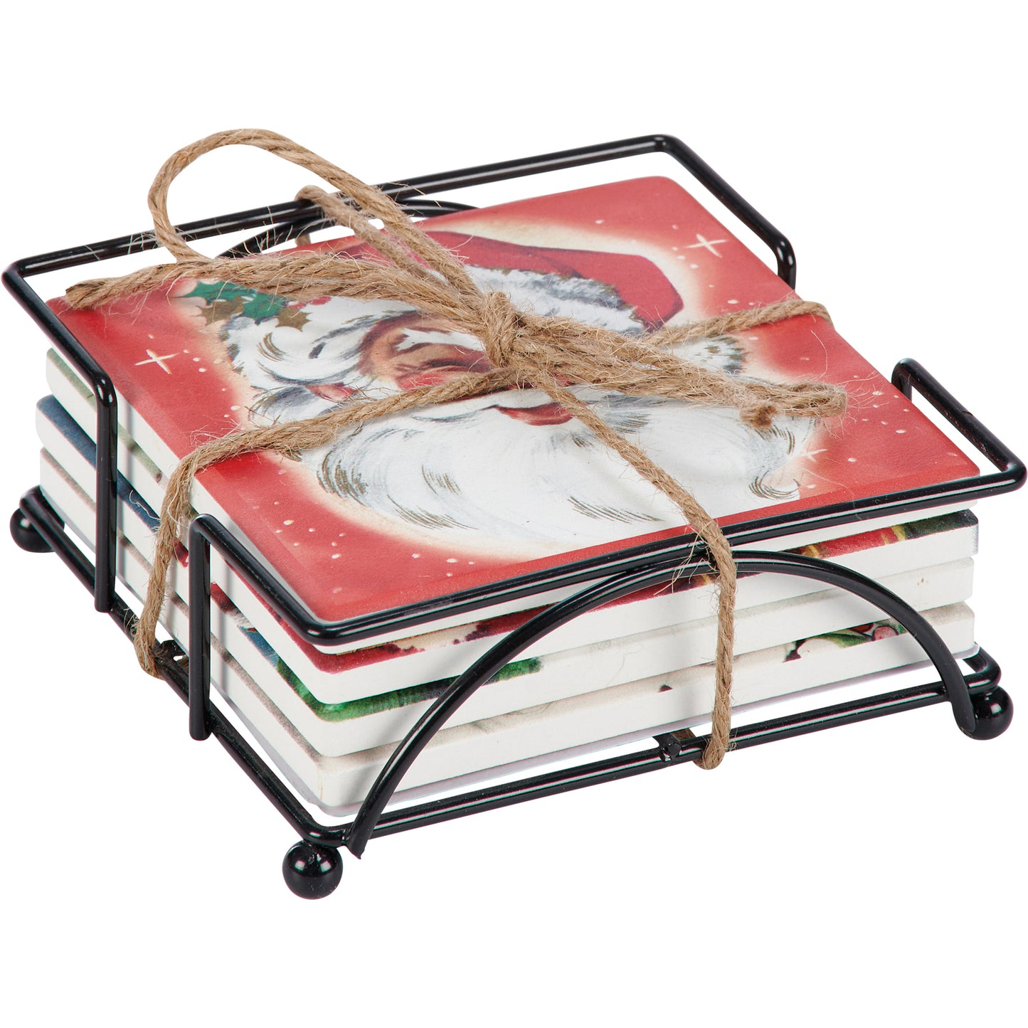 A coordinating set of four stoneware coasters with cork bases from our Christmas Collection displaying vintage jolly Santa designs on each. Our Santa Claus coaster set includes a wire holder to store coasters and comes packaged with jute rope tied around set. A fun and functional seasonal home accent perfect for any room.