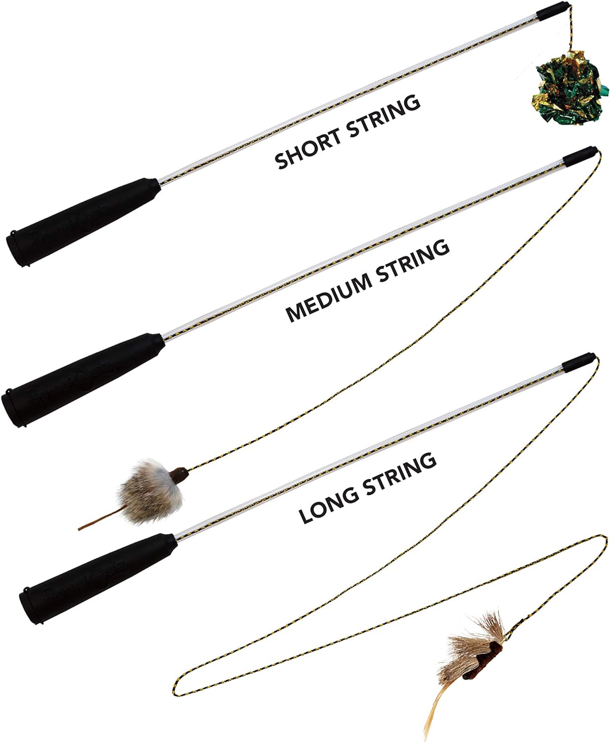 Premium handcrafted cat toy that mimics natural critter movement. Durability and built in safety features help keep cats safe during play. Uniquely designed for playtime versatility with its adjustable string lengths and convenient storage in the handle.