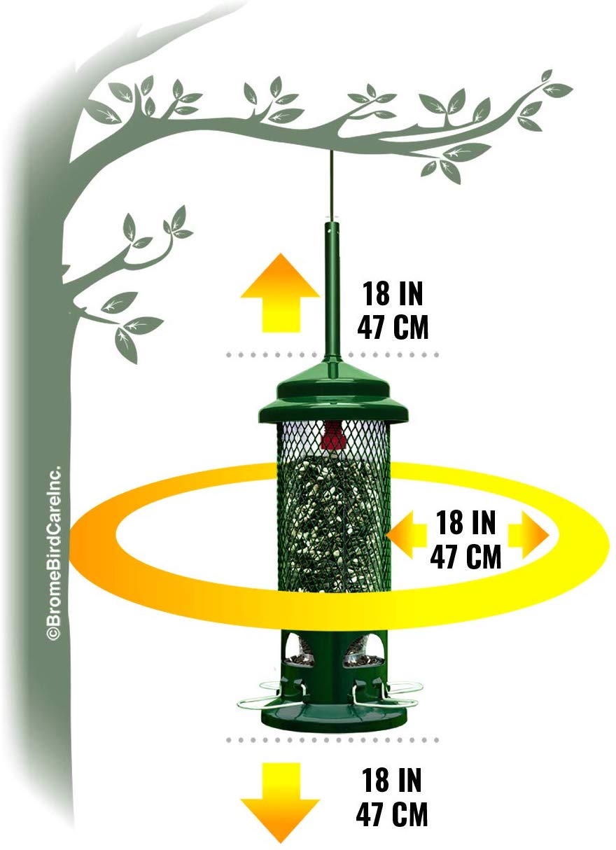 Openings in the bottom section of the metal mesh shroud align with the seed tray, providing birds access to the food. When a squirrel climbs onto the feeder, its weight automatically forces the shroud down, closing access to the seed. Squirrels and some large birds are blocked from accessing the seed, but are not harmed in any way.