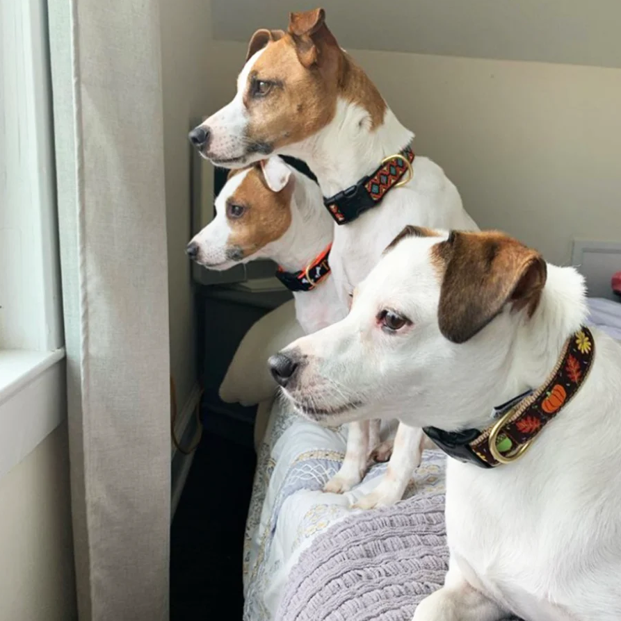 The large is 1" wide and adjusts to fit a 15-21" neckline. Colorful yet subdued, this black ribbon has a fun embroidered Halloween pumpkins and ghosts design. All Up Country designer ribbon collars are made from high-tensile strength nylon webbing with sewn-on polyester/nylon ribbons. The ribbons are stain and fray-resistant and designed to last a lifetime. All collar and lead hardware is cast, not welded brass. Collars fasten with Quick-Release Buckles, which are Coast Guard approved for high-weight hold. Machine washable, air dry. Made in the USA.