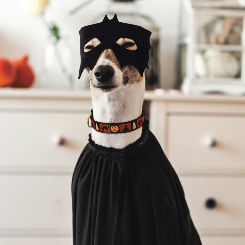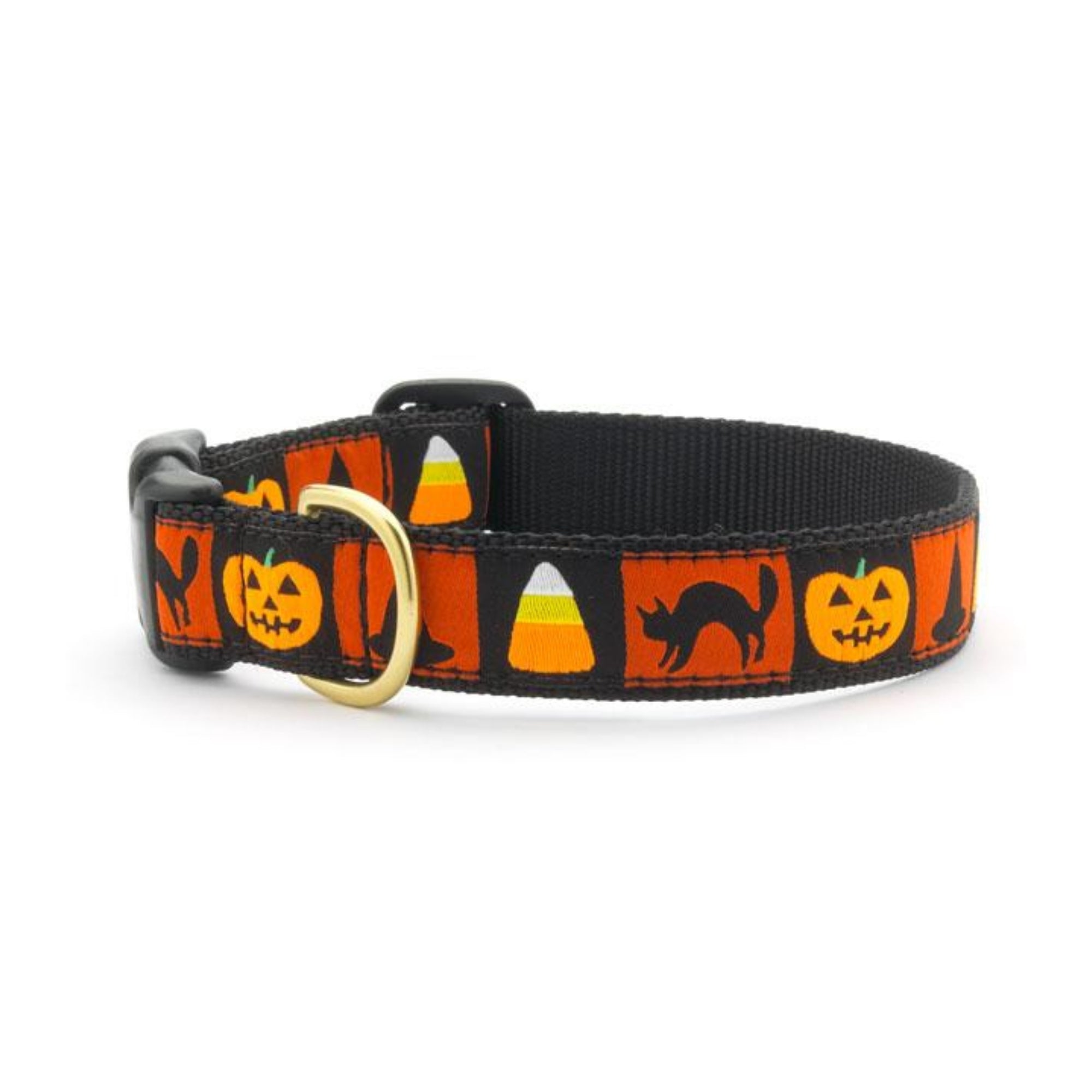 Up Country Dog Collar-Halloween Design Motif Made in Rhode Island. This company pairs fabulous quality, function and fashion. The quick release buckles are Coast Guard approved for high weight hold. Designed for the discriminating taste. Designed for years of use, made from high tensile strength nylon webbing and are stain and fray resistent. Machine wash cold, line dry. Up Country supports their community through numerous shelters and rescues so you can be proud to have your dog wear Up Country. Item Specifications: Size Medium: 12-18"