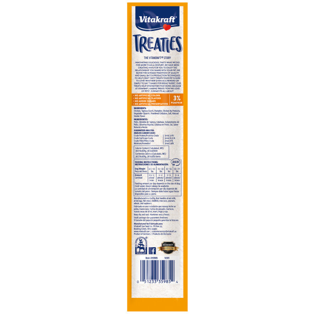 Vitakraft Treaties Smoked Chicken recipe are a grab-and-go treat for munchable fun while on the run. The perforated strips on the package allow for easy tear away for single stick servings. Made up of 90% pure chicken muscle meat each stick is free of artificial colors, flavors and preservatives with no added sugars. Enhanced with a smokey flavor your dog is sure to go wild for.